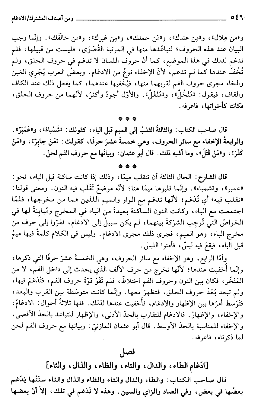 وأمّا الرابع، وهو الإخفاء مع سائر الحروف، وهي الخمسةَ عشرَ حرفًا التي ذكرها، وإنّما أُخفيت عندها؛ لأنّها تخرج من حرف الألف الذي يحدث إلى داخل الفم، لا من المَنْخَر، فكان بين النون وحروف الفم اختلاطٌ، فلم تَقْوَ قوَّةَ حروف الفم، فتُدّغمَ فيها، ولم تبعد بُعْدَ حروف الحلق، فتظهرَ معها. وإنّما كانت متوسّطة بين القرب والبعد، فتَوّسط أمرُها بين الإظهار والإدغام، فأُخفيت عندها لذلك. فلها ثلاثةُ أحوال: الادغامُ، والإخفاء، والإظهارُ. فالادغام للتقارب بالحدّ الأدنى، والإظهار للتباعد بالحدّ الأقصى، والإخفاء للمناسبة بالحدّ الأوسط. قال أبو عثمان المازنيّ: وبيانها مع حروف الفم لحن لما ذكرناه، فاعرفه.