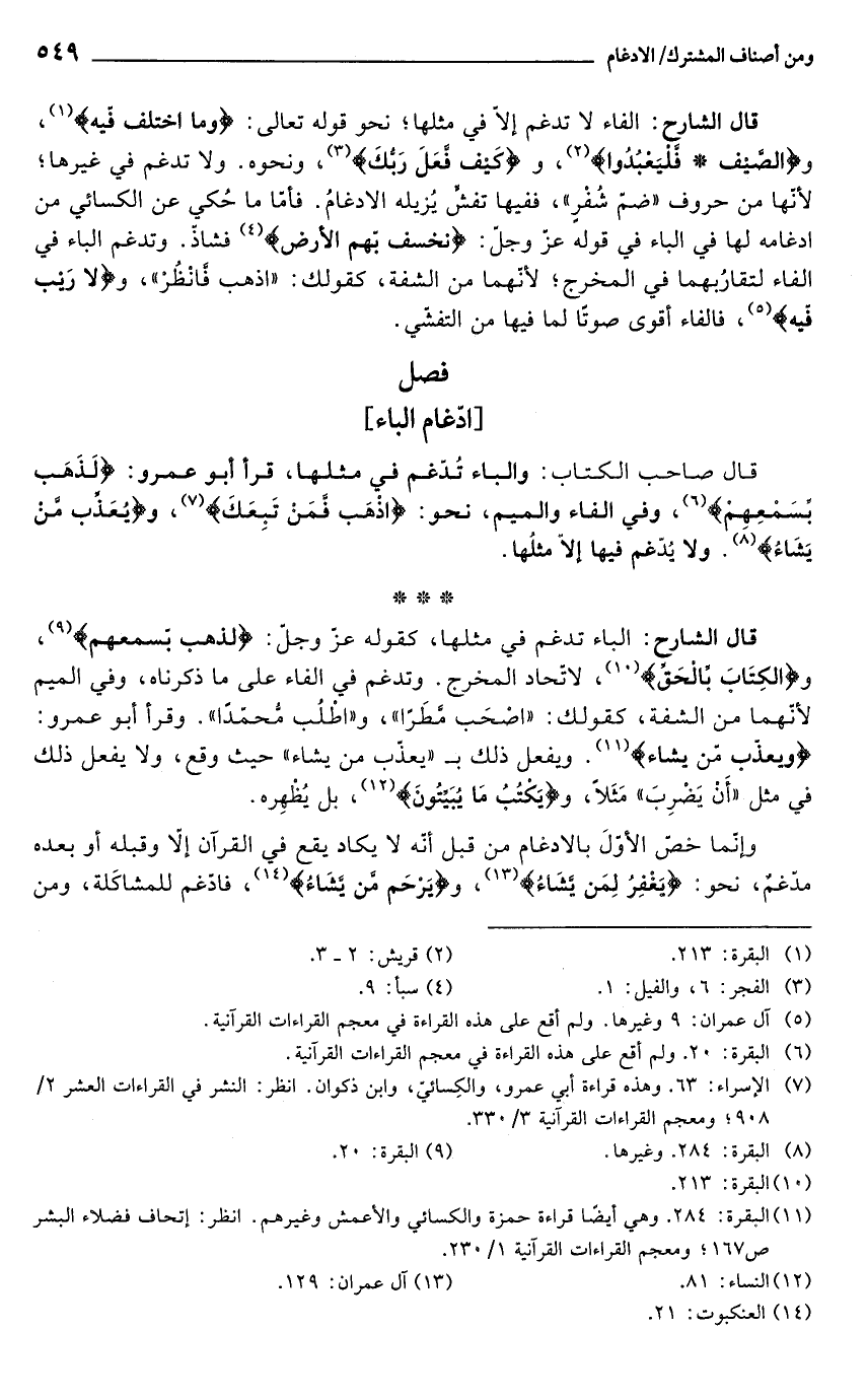 قال الشارح: الباء تدغم في مثلها، كقوله عر وجل: {لذهب بّسمعهم} (¬9)، و {الكِتَابَ بِّالْحَقِّ} (¬10)، لاتّحاد المخرج. وتدغم في الفاء على ما ذكرناه، وفي الميم لأنّهما من الشفة، كقولك: "اصْحَب مَّطَرًا"، و"اطْلُب مُّحمّدًا". وقرأ أبو عمرو: {وَيُعَذِّبُ مَنْ يَشَاء} (¬11). ويفعل ذلك بـ "يعذّب من يشاء" حيث وقع، ولا يفعل ذلك في مثل "أَنْ يَضْرِبَ" مَثَلًا، و {يَكْتُبُ مَا يُبَيِّتُونَ} (¬12)، بل يُظْهِره.