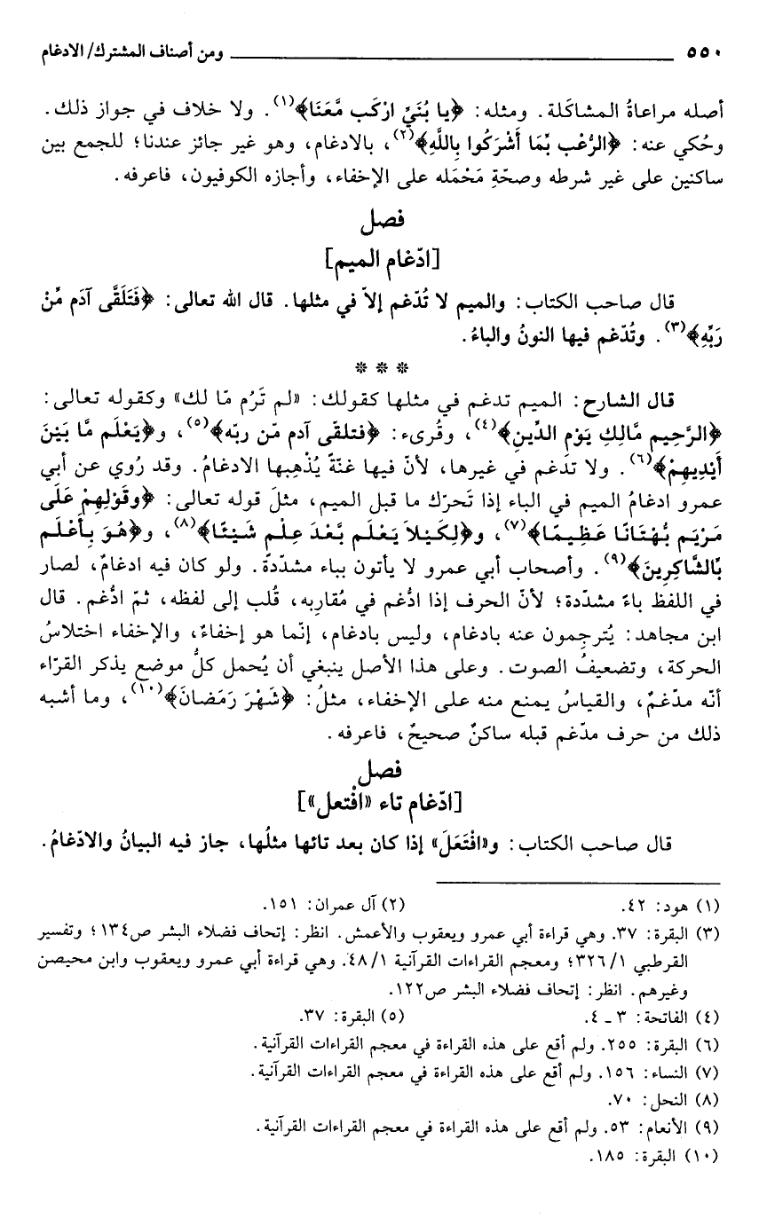 قال صاحب الكتاب: والميم لا تدغم إلا في مثلها. قال الله تعالى: {فتلقى آدم من ربه} (¬3). وتدغم فيها النون والباء.