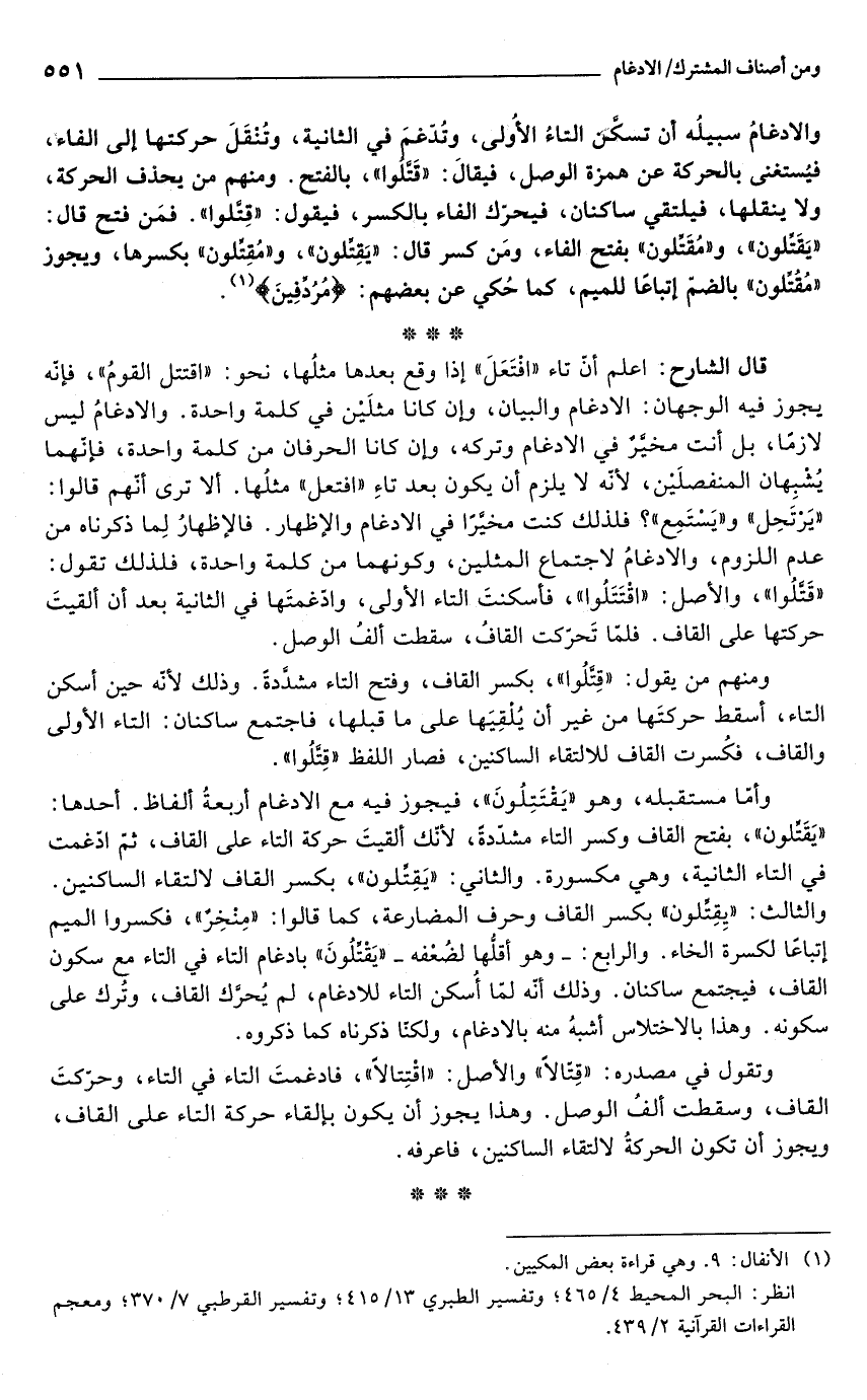 قال الشارح: اعلم أنّ تاء "افْتَعَلَ" إذا وقع بعدها مثلُها، نحو: "اقتتل القومُ"، فإنّه يجوز فيه الوجهان. الادغام والبيان، وإن كانا مثلَيْن في كلمة واحدة. والادغامُ ليس لازمًا، بل أنت مخيَّرٌ في الادغام وتركه، وإن كانا الحرمان من كلمة واحدة، فإنّهما يُشْبِهان المنفصلَيْن, لأنّه لا يلزم أن يكون بعد تاءِ "افتعل" مثلُها. ألا ترى أنّهم قالوا: "يَرْتَحِل" و"يَسْتَمِع"؟ فلذلك كنت مخيَّرًا في الادغام والإظهار. فالإظهارُ لِما ذكرناه من عدم اللزوم، والادغامُ لاجتماع المثلين، وكونهما من كلمة واحدة، فلذلك تقول: "قَتَّلُوا"، والأصل: "اقْتَتَلُوا"، فأسكنتَ التاء الأولى، وادّغمتَها في الثانية بعد أن ألقيتَ حركتها على القاف. فلمّا تَحرّكت القافُ، سقطت ألفُ الوصل.