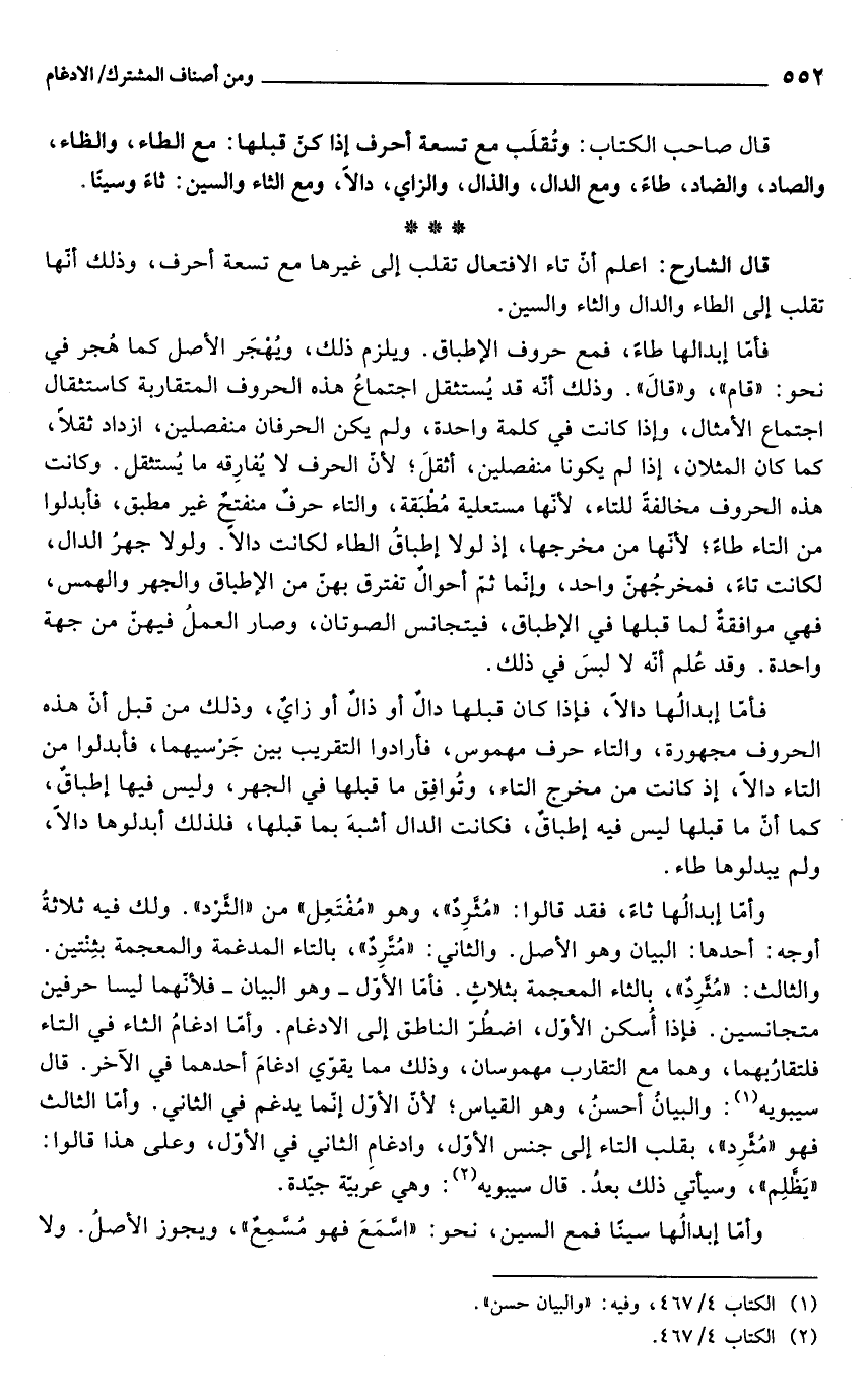 وأمّا إبدالُها ثاءً، فقد قالوا: "مُثَّرِدٌ"، وهو "مُفْتَعِل" من "الثَّرْد". ولك فيه ثلاثةُ أوجه: أحدها: البيان وهو الأصل. والثاني: "مُتَّرِدٌ"، بالتاء المدغمة والمعجمة بثِنْتين. والثالث: "مُثَّرِدٌ"، بالثاء المعجمة بثلاتٍ. فأمّا الأول - وهو البيان - فلأنّهما ليسا حرفين متجانسين. فإذا أُسكن الأول، اضطُرّ الناطق إلى الادغام. وأمّا ادغامُ الثاء في التاء فلتقارُبهما، وهما مع التقارب مهموسان، وذلك مما يقوّي ادغامَ أحدهما في الآخر. قال سيبويه (¬1): والبيانُ أحسنُ، وهو القياس؛ لأنّ الأوّل إنّما يدغم في الثاني. وأمّا الثالث فهو"مُثَّرِد"، بقلب التاء إلى جنس الأوّل، وادغامِ الثاني في الأوّل، وعلى هذا قالوا: "يَظَّلِم"، وسيأتي ذلك بعدُ. قال سيبويه (¬2): وهي عربيّة جيدة.