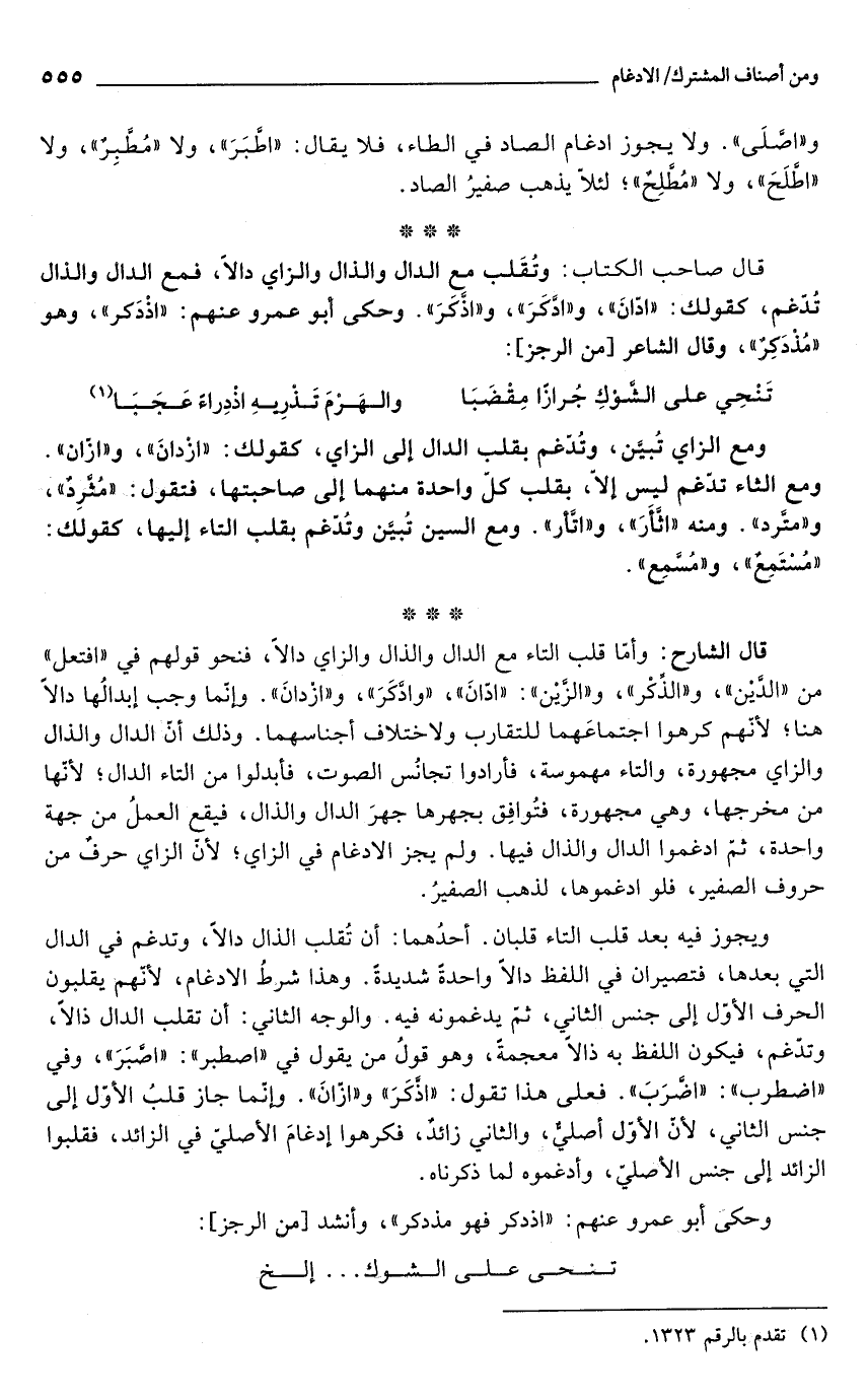 قال الشارح: وأمّا قلب التاء مع الدال والذال والزاي دالًا، فنحو قولهم في "افتعل" من "الدَّيْن"، و"الذَّكْر"، و"الزَّيْن": "ادّانَ"، "وادَّكَرَ"، و"ازْدانَ". وإنّما وجب إبدالُها دالًا هنا؛ لأنّهم كرهوا اجتماعَهما للتقارب ولاختلاف أجناسهما. وذلك أنّ الدال والذال والزاي مجهورة، والتاء مهموسة، فأرادوا تجانُس الصوت، فأبدلوا من التاء الدال؛ لأنّها من مخرجها، وهي مجهورة، فتُوافِق بجهرها جهرَ الدال والذال، فيقع العملُ من جهة واحدة، ثم ادغموا الدال والذال فيها. ولم يجز الادغام في الزاي؛ لأنّ الزاي حرفٌ من حروف الصغير, فلو ادغموها, لذهب الصفيرُ.