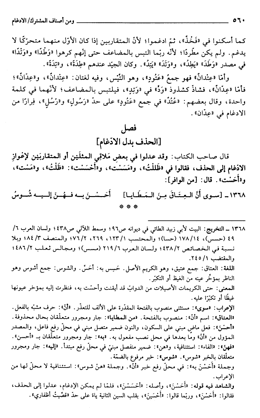 1368 - التخريج: البيت لأبي زبيد الطائي في ديوانه ص 96؛ وسمط اللآلي ص 438؛ ولسان العرب 6/ 49 (حس)، 14/ 178 (حسا)؛ والمحتسب 1/ 123، 269، 2/ 76؛ والمنصف 3/ 84؛ وبلا نسبة في الخصائص 2/ 438؛ ولسان العرب 6/ 219 (مسس)؛ ومجالس ثعلب 2/ 486؛ والمقتضب 1/ 245.