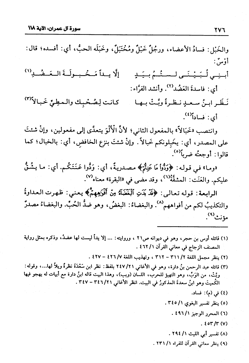 وَالْمَعْنَيَانِ مُرَادٌ فِي الْآيَةِ، فَكَانُوا يَقْعُدُونَ عَنِ الْخُرُوجِ وَيُقْعِدُونَ غَيْرَهُمْ. وَالْمَعْنَى أَنَّ مِنْ دُخَلَائِكُمْ وَجِنْسِكُمْ «1» وَمِمَّنْ أَظْهَرَ إِيمَانَهُ لَكُمْ. فَالْمُنَافِقُونَ فِي ظَاهِرِ الْحَالِ مِنْ أَعْدَادِ الْمُسْلِمِينَ بِإِجْرَاءِ أَحْكَامِ الْمُسْلِمِينَ عَلَيْهِمْ. وَاللَّامُ فِي قَوْلِهِ (لَمَنْ) لَامُ توكيد، والثانية لام قسم، و (من) فِي مَوْضِعِ نَصْبٍ، وَصِلَتُهَا (لَيُبَطِّئَنَّ) لِأَنَّ فِيهِ مَعْنَى الْيَمِينِ، وَالْخَبَرُ (مِنْكُمْ). وَقَرَأَ مُجَاهِدٌ وَالنَّخَعِيُّ وَالْكَلْبِيُّ (وَإِنَّ مِنْكُمْ لَمَنْ لَيُبَطِّئَنَّ) بِالتَّخْفِيفِ، وَالْمَعْنَى وَاحِدٌ. وَقِيلَ: الْمُرَادُ بِقَوْلِهِ (وَإِنَّ مِنْكُمْ لَمَنْ لَيُبَطِّئَنَّ) بَعْضُ الْمُؤْمِنِينَ، لِأَنَّ اللَّهَ خَاطَبَهُمْ بِقَوْلِهِ: (وَإِنَّ مِنْكُمْ) وَقَدْ فَرَّقَ اللَّهُ تَعَالَى بَيْنَ الْمُؤْمِنِينَ وَالْمُنَافِقِينَ بِقَوْلِهِ (وَما هُمْ مِنْكُمْ «2») وَهَذَا يَأْبَاهُ مَسَاقُ الْكَلَامِ وَظَاهِرُهُ. وَإِنَّمَا جَمَعَ بَيْنَهُمْ فِي الْخِطَابِ مِنْ جِهَةِ الْجِنْسِ وَالنَّسَبِ كَمَا بَيَّنَّا لَا مِنْ جِهَةِ الْإِيمَانِ. هَذَا قَوْلُ الْجُمْهُورِ وَهُوَ الصَّحِيحُ إِنْ شَاءَ اللَّهُ تَعَالَى، وَاللَّهُ أَعْلَمُ. يَدُلُّ عَلَيْهِ قَوْلُهُ: (فَإِنْ أَصابَتْكُمْ مُصِيبَةٌ) أَيْ قَتْلٌ وَهَزِيمَةٌ (قالَ قَدْ أَنْعَمَ اللَّهُ عَلَيَّ) يَعْنِي بِالْقُعُودِ، وَهَذَا لَا يَصْدُرُ إِلَّا مِنْ مُنَافِقٍ، لَا سِيَّمَا فِي ذَلِكَ الزَّمَانِ الْكَرِيمِ، بعيد أن يقول مُؤْمِنٌ. وَيَنْظُرُ إِلَى هَذِهِ الْآيَةِ مَا رَوَاهُ الْأَئِمَّةُ عَنْ أَبِي هُرَيْرَةَ عَنِ النَّبِيِّ صَلَّى اللَّهُ عَلَيْهِ وَسَلَّمَ إِخْبَارًا عَنِ الْمُنَافِقِينَ (إِنَّ أَثْقَلَ صَلَاةٍ عَلَيْهِمْ صَلَاةُ الْعِشَاءِ وَصَلَاةُ الْفَجْرِ ولو يعلمون ما فيهما لا توهما وَلَوْ حَبْوًا) الْحَدِيثَ. فِي رِوَايَةٍ (وَلَوْ عَلِمَ أَحَدُهُمْ أَنَّهُ يَجِدُ عَظْمًا سَمِينًا لَشَهِدَهَا) يَعْنِي صلاة العشاء. يقول: لو لاح شي مِنَ الدُّنْيَا يَأْخُذُونَهُ وَكَانُوا عَلَى يَقِينٍ مِنْهُ لَبَادَرُوا إِلَيْهِ. وَهُوَ مَعْنَى قَوْلِهِ: (وَلَئِنْ أَصابَكُمْ فَضْلٌ مِنَ اللَّهِ) أَيْ غَنِيمَةٌ وَفَتْحٌ (لَيَقُولَنَّ) هَذَا الْمُنَافِقُ قَوْلَ نَادِمٍ حَاسِدٍ (يَا لَيْتَنِي كُنْتُ مَعَهُمْ فَأَفُوزَ فَوْزاً عَظِيماً) (كَأَنْ لَمْ تَكُنْ «3» بَيْنَكُمْ وَبَيْنَهُ مَوَدَّةٌ) فَالْكَلَامُ فِيهِ تَقْدِيمٌ وَتَأْخِيرٌ. وقيل: المعنى (لَيَقُولَنَّ كَأَنْ لَمْ تَكُنْ بَيْنَكُمْ وَبَيْنَهُ مَوَدَّةٌ) أَيْ كَأَنْ لَمْ يُعَاقِدْكُمْ عَلَى الْجِهَادِ. وَقِيلَ: هُوَ فِي مَوْضِعِ نَصْبٍ عَلَى الْحَالِ. وَقَرَأَ الْحَسَنُ لَيَقُولُنَّ) بِضَمِّ اللَّامِ عَلَى مَعْنَى (مَنْ)، لِأَنَّ مَعْنَى قَوْلِهِ (لَمَنْ لَيُبَطِّئَنَّ) لَيْسَ يَعْنِي رَجُلًا بِعَيْنِهِ. وَمَنْ فَتَحَ اللَّامَ أَعَادَ فَوَحَّدَ الضَّمِيرَ عَلَى لَفْظِ (مَنْ). وَقَرَأَ ابْنُ كَثِيرٍ وَحَفْصٌ عَنْ عَاصِمٍ (كَأَنْ لَمْ تَكُنْ) بِالتَّاءِ عَلَى لَفْظِ الْمَوَدَّةِ. وَمَنْ قَرَأَ بِالْيَاءِ «4» جَعَلَ مَوَدَّةً بِمَعْنَى الْوُدِّ. وَقَوْلُ الْمُنَافِقِ (يَا لَيْتَنِي كُنْتُ مَعَهُمْ) عَلَى وَجْهِ الْحَسَدِ أَوِ الْأَسَفِ