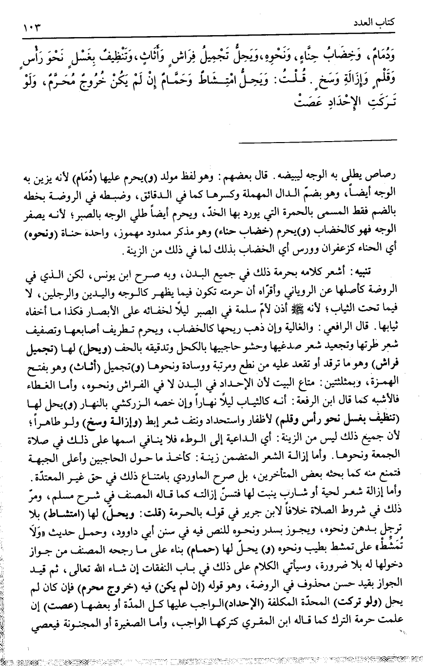 وَدُمَامٍ، وَخِضَابِ حِنَّاءٍ، وَنَحْوِهِ، وَيَحِلُّ تَجْمِيلُ فِرَاشٍ وَأَثَاثٍ، وَتَنْظِيفٌ بِغَسْلِ نَحْوِ رَأْسٍ وَقَلْمٍ وَإِزَالَةِ وَسَخٍ قُلْت: وَيَحِلُّ امْتِشَاطٌ وَحَمَّامٌ إنْ لَمْ يَكُنْ خُرُوجٌ مُحَرَّمٌ، وَلَوْ تَرَكَتْ الْإِحْدَادَ عَصَتْ