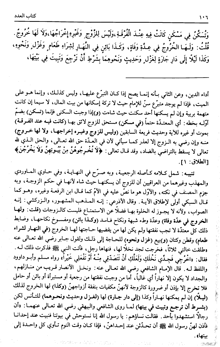 تَنْبِيهٌ شَمِلَ كَلَامُهُ كَأَصْلِهِ الرَّجْعِيَّةَ، وَبِهِ صَرَّحَ فِي النِّهَايَةِ، وَفِي حَاوِي الْمَاوَرْدِيُّ وَالْمُهَذَّبِ وَغَيْرِهِمَا مِنْ الْعِرَاقِيِّينَ أَنَّ لِلزَّوْجِ أَنْ يُسْكِنَهَا حَيْثُ شَاءَ لِأَنَّهَا فِي حُكْمِ الزَّوْجَةِ، وَبِهِ جَزَمَ الْمُصَنِّفُ فِي نُكَتِهِ، وَالْأَوَّلُ هُوَ مَا نَصَّ عَلَيْهِ فِي الْأُمِّ كَمَا قَالَ ابْنُ الرِّفْعَةِ وَغَيْرُهُ، وَهُوَ كَمَا قَالَ السُّبْكِيُّ أَوْلَى لِإِطْلَاقِ الْآيَةِ وَقَالَ الْأَذْرَعِيُّ: إنَّهُ الْمَذْهَبُ الْمَشْهُورُ، وَالزَّرْكَشِيُّ: إنَّهُ الصَّوَابُ، وَلِأَنَّهُ لَا يَجُوزُ لَهُ الْخَلْوَةُ بِهَا فَضْلًا عَنْ الِاسْتِمْتَاعِ فَلَيْسَتْ كَالزَّوْجَاتِ (قُلْت: وَلَهَا الْخُرُوجُ فِي عِدَّةِ وَفَاةٍ) وَعِدَّةِ وَطْءِ شُبْهَةٍ وَنِكَاحٍ فَاسِدٍ (وَكَذَا بَائِنٌ) وَمَفْسُوخٍ نِكَاحُهَا، وَضَابِطُ ذَلِكَ كُلُّ مُعْتَدَّةٍ لَا تَجِبُ نَفَقَتُهَا وَلَمْ يَكُنْ لَهَا مَنْ يَقْضِيهَا حَاجَتَهَا لَهَا الْخُرُوجُ (فِي النَّهَارِ لِشِرَاءِ طَعَامٍ) وَقُطْنٍ وَكَتَّانٍ (وَ) بَيْعِ (غَزْلٍ وَنَحْوِهِ) لِلْحَاجَةِ إلَى ذَلِكَ «وَلِقَوْلِ جَابِرٍ - رَضِيَ اللَّهُ تَعَالَى عَنْهُ - طَلُقَتْ خَالَتِي ثَلَاثًا، فَخَرَجَتْ تَجُدُّ نَخْلًا لَهَا، فَنَهَاهَا رَجُلٌ، فَأَتَتْ النَّبِيَّ - صَلَّى اللَّهُ عَلَيْهِ وَسَلَّمَ - فَذَكَرَتْ ذَلِكَ لَهُ فَقَالَ: اُخْرُجِي فَجُدِّي نَخْلَكِ وَلَعَلَّكِ أَنْ تَتَصَدَّقِي مِنْهُ أَوْ تَفْعَلِي خَيْرًا» رَوَاهُ مُسْلِمٌ وَأَبُو دَاوُد وَاللَّفْظُ لَهُ قَالَ الْإِمَامُ الشَّافِعِيُّ - رَضِيَ اللَّهُ تَعَالَى عَنْهُ -: وَنَخْلُ الْأَنْصَارِ قَرِيبٌ مِنْ مَنَازِلِهِمْ، وَالْجِدَادُ لَا يَكُونُ إلَّا نَهَارًا أَيْ غَالِبًا، أَمَّا مَنْ وَجَبَتْ نَفَقَتُهَا مِنْ رَجْعِيَّةٍ أَوْ مُسْتَبْرَأَةٍ أَوْ بَائِنٍ أَوْ حَامِلٍ فَلَا تَخْرُجُ إلَّا بِإِذْنٍ أَوْ ضَرُورَةٍ كَالزَّوْجَةِ لِأَنَّهُنَّ مَكْفِيَّاتٌ بِنَفَقَةِ أَزْوَاجِهِنَّ (وَكَذَا) لَهَا الْخُرُوجُ لِذَلِكَ (لَيْلًا) إنْ لَمْ يُمْكِنْهَا نَهَارًا وَكَذَا (إلَى دَارِ جَارَةٍ) لَهَا (لِغَزْلٍ وَحَدِيثٍ وَنَحْوِهِمَا) لِلتَّأَنُّسِ لَكِنْ (بِشَرْطِ أَنْ تَرْجِعَ وَتَبِيتَ فِي بَيْتِهَا) لِمَا رَوَى الشَّافِعِيُّ وَالْبَيْهَقِيُّ - رَضِيَ اللَّهُ تَعَالَى عَنْهُمَا -: «أَنَّ رِجَالًا اُسْتُشْهِدُوا بِأُحُدٍ فَقَالَتْ نِسَاؤُهُمْ: يَا رَسُولَ اللَّهِ إنَّا نَسْتَوْحِشُ فِي بُيُوتِنَا فَنَبِيتُ عِنْدَ إحْدَانَا فَأَذِنَ لَهُنَّ رَسُولُ اللَّهِ - صَلَّى اللَّهُ عَلَيْهِ وَسَلَّمَ - أَنْ تَحَدَّثْنَ عِنْدَ إحْدَاهُنَّ، فَإِذَا كَانَ وَقْتُ النَّوْمِ تَأْوِي كُلُّ وَاحِدَةٍ إلَى بَيْتِهَا»