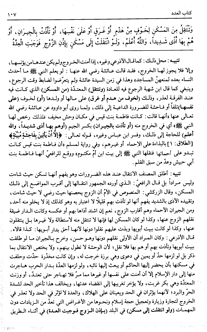 تَنْبِيهٌ أَطْلَقَ الْمُصَنِّفُ الِانْتِقَالَ عِنْدَ هَذِهِ الضَّرُورَاتِ وَهُوَ يُفْهِمُ أَنَّهَا تَسْكُنُ حَيْثُ شَاءَتْ وَلَيْسَ مُرَادًا بَلْ قَالَ الرَّافِعِيُّ: الَّذِي أَوْرَدَهُ الْجُمْهُورُ انْتِقَالُهَا إلَى أَقْرَبِ الْمَوَاضِعِ إلَى ذَلِكَ الْمَسْكَنِ، وَقَالَ الزَّرْكَشِيُّ: الْمَنْصُوصُ فِي الْأُمِّ أَنَّ الزَّوْجَ يُحَصِّنُهَا حَيْثُ رَضِيَ لَا حَيْثُ شَاءَتْ، وَتَقْيِيدُهُ الْأَذَى بِالشَّدِيدِ يُفْهِمُ أَنَّهَا لَوْ تَأَذَّتْ بِهِمْ قَلِيلًا لَا اعْتِبَارَ بِهِ وَهُوَ كَذَلِكَ إذْ لَا يَخْلُو مِنْهُ أَحَدٌ، وَمِنْ الْجِيرَانِ الْأَحْمَاءُ وَهُمْ أَقَارِبُ الزَّوْجِ، نَعَمْ إنْ اشْتَدَّ أَذَاهَا بِهِمْ أَوْ عَكْسُهُ وَكَانَتْ الدَّارُ ضَيِّقَةً نَقَلَهُمْ الزَّوْجُ عَنْهَا، وَكَذَا لَوْ كَانَ الْمَسْكَنُ لَهَا فَإِنَّهَا لَا تَنْتَقِلُ مِنْهُ لِاسْتِطَالَةٍ وَلَا غَيْرِهَا بَلْ يَنْتَقِلُونَ عَنْهَا، وَكَذَا لَوْ كَانَتْ بِبَيْتِ أَبَوَيْهَا وَبَذَتْ عَلَيْهِمْ نَقَلُوا دُونَهَا لِأَنَّهَا أَحَقُّ بِدَارِ أَبَوَيْهَا: كَذَا قَالَاهُ قَالَ الْأَذْرَعِيُّ: وَكَأَنَّ الْمُرَادَ أَنَّ الْأَوْلَى نَقْلُهُمْ دُونَهَا وَهُوَ حَسَنٌ، وَخَرَجَ بِالْجِيرَانِ مَا لَوْ طَلُقَتْ بِبَيْتِ أَبَوَيْهَا وَتَأَذَّتْ بِهِمْ أَوْ هُمْ بِهَا فَلَا نَقْلَ؛ لِأَنَّ الْوَحْشَةَ لَا تَطُولُ بَيْنَهُمْ، وَلَا يَخْتَصُّ الِانْتِقَالُ بِمَا ذُكِرَ بَلْ لَوْ لَزِمَهَا حَدٌّ أَوْ يَمِينٌ فِي دَعْوَى وَهِيَ بَرْزَةٌ خَرَجَتْ لَهُ، وَإِنْ كَانَتْ مُخَدَّرَةً حُدَّتْ وَحُلِّفَتْ فِي مَسْكَنِهَا بِأَنْ يَحْضُرَ إلَيْهَا الْحَاكِمُ أَوْ يَبْعَثَ إلَيْهَا نَائِبَهُ، وَلَوْ لَزِمَهَا الْعِدَّةُ بِدَارِ الْحَرْبِ هَاجَرَتْ مِنْهَا إلَى دَارِ الْإِسْلَامِ إلَّا إنْ أَمِنَتْ عَلَى نَفْسِهَا أَوْ غَيْرِهَا مِمَّا مَرَّ فَلَا تُهَاجِرُ حَتَّى تَعْتَدَّ، أَوْ زَنَتْ الْمُعْتَدَّةُ وَهِيَ بِكْرٌ غُرِّبَتْ، وَلَا يُؤَخَّرُ تَغْرِيبُهَا إلَى انْقِضَاءِ عِدَّتِهَا، وَيُخَالِفُ هَذَا تَأْخِيرَ الْحَدِّ لِشِدَّةِ الْحَرِّ وَالْبَرْدِ؛ لِأَنَّهُمَا يُؤَثِّرَانِ فِي الْحَدِّ وَيُعِينَانِ عَلَى الْهَلَاكِ، وَالْعِدَّةُ لَا تُؤَثِّرُ فِي الْحَدِّ وَلَا تُعْذَرُ فِي الْخُرُوجِ لِتِجَارَةٍ وَزِيَارَةٍ وَتَعْجِيلِ حَجَّةِ إسْلَامٍ وَنَحْوِهَا مِنْ الْأَغْرَاضِ الَّتِي تُعَدُّ مِنْ الزِّيَادَاتِ دُونَ الْمُهِمَّاتِ