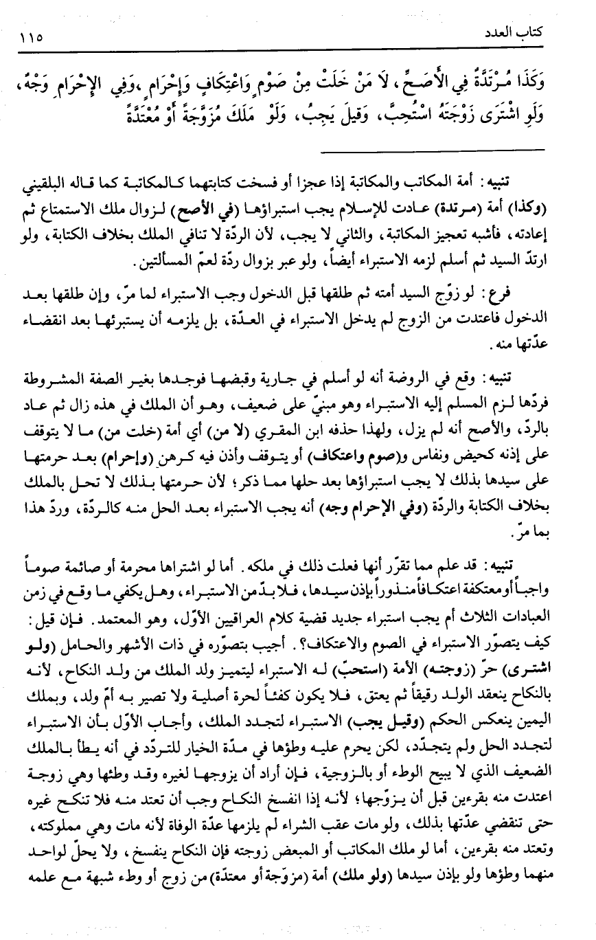 تَنْبِيهٌ قَدْ عُلِمَ مِمَّا تَقَرَّرَ أَنَّهَا فَعَلَتْ ذَلِكَ فِي مِلْكِهِ أَمَّا لَوْ اشْتَرَاهَا مُحْرِمَةً أَوْ صَائِمَةً صَوْمًا وَاجِبًا أَوْ مُعْتَكِفَةً اعْتِكَافًا مَنْذُورًا بِإِذْنِ سَيِّدِهَا، فَلَا بُدَّ مِنْ الِاسْتِبْرَاءِ، وَهَلْ يَكْفِي مَا وَقَعَ فِي زَمَنِ الْعِبَادَاتِ الثَّلَاثِ أَمْ يَجِبُ اسْتِبْرَاءٌ جَدِيدٌ قَضِيَّةُ كَلَامِ الْعِرَاقِيِّينَ الْأَوَّلُ، وَهُوَ الْمُعْتَمَدُ