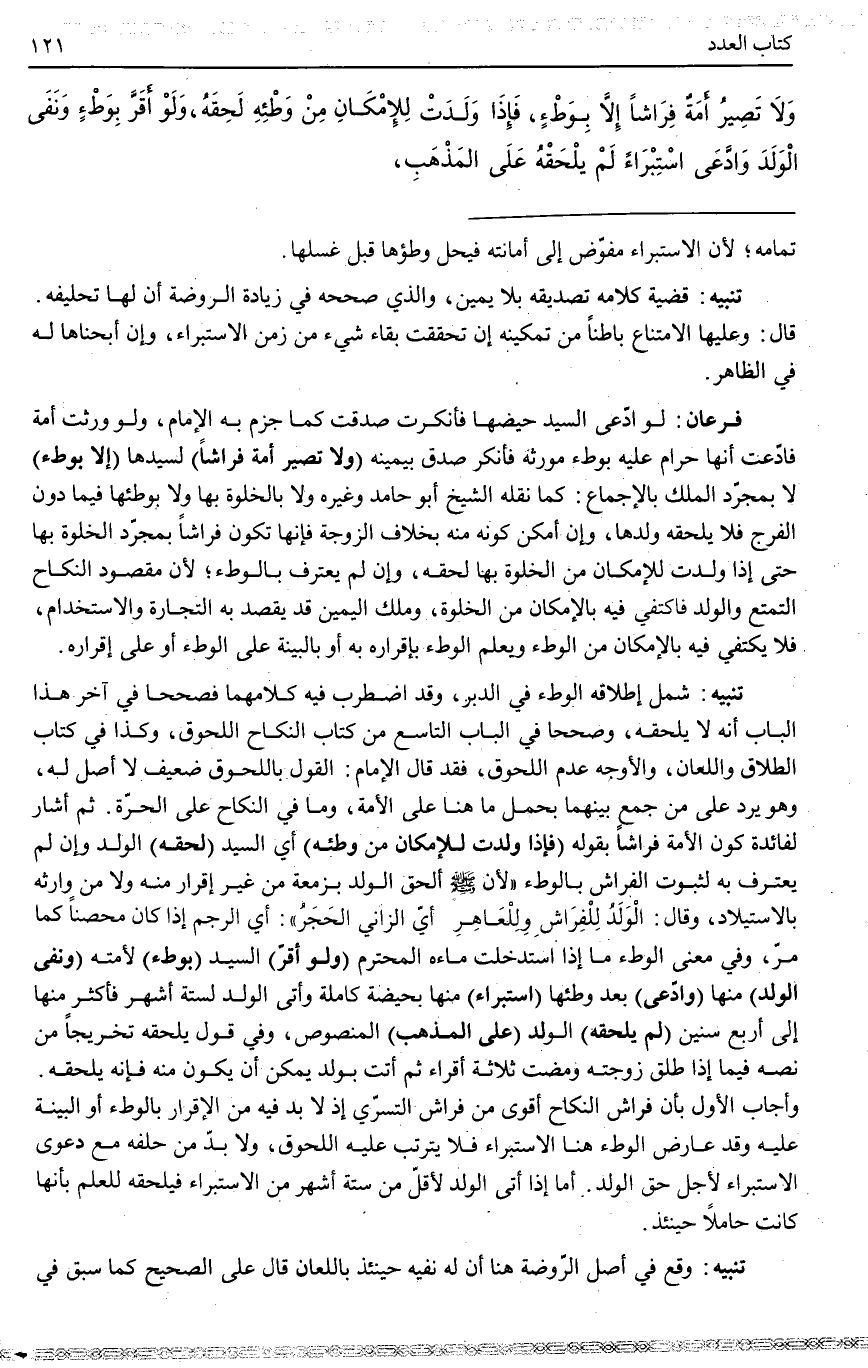 تَنْبِيهٌ قَضِيَّةُ كَلَامِهِ تَصْدِيقُهُ بِلَا يَمِينٍ، وَاَلَّذِي صَحَّحَهُ فِي زِيَادَةِ الرَّوْضَةِ أَنَّ لَهَا تَحْلِيفَهُ قَالَ: وَعَلَيْهَا الِامْتِنَاعُ بَاطِنًا مِنْ تَمْكِينِهِ إنْ تَحَقَّقَتْ بَقَاءَ شَيْءٍ مِنْ زَمَنِ الِاسْتِبْرَاءِ، وَإِنْ أَبَحْنَاهَا لَهُ فِي الظَّاهِرِ فَرْعَانِ: لَوْ ادَّعَى السَّيِّدُ حَيْضَهَا فَأَنْكَرَتْ صُدِّقَتْ كَمَا جَزَمَ بِهِ الْإِمَامُ، وَلَوْ وُرِثَتْ أَمَةٌ فَادَّعَتْ أَنَّهَا حَرَامٌ عَلَيْهِ بِوَطْءِ مُوَرِّثِهِ فَأَنْكَرَ صُدِّقَ بِيَمِينِهِ