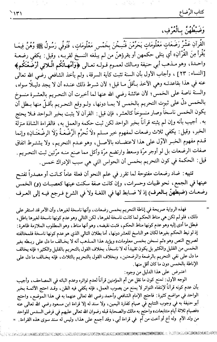ـــــــــــــــــــــــــــــQ «عَنْ عَائِشَةَ - رَضِيَ اللَّهُ تَعَالَى عَنْهَا - كَانَ فِيمَا أَنْزَلَ اللَّهُ فِي الْقُرْآنِ عَشْرُ رَضَعَاتٍ مَعْلُومَاتٍ يُحَرِّمْنَ فَنُسِخْنَ بِخَمْسٍ مَعْلُومَاتٍ، فَتُوُفِّيَ رَسُولُ اللَّهِ - صَلَّى اللَّهُ عَلَيْهِ وَسَلَّمَ - وَهُنَّ فِيمَا يُقْرَأُ مِنْ الْقُرْآنِ» أَيْ يُتْلَى حُكْمُهُنَّ أَوْ يَقْرَؤُهُنَّ مَنْ لَمْ يَبْلُغْهُ النَّسْخُ لِقُرْبِهِ وَقِيلَ: يَكْفِي رَضْعَةٌ وَاحِدَةٌ، وَهُوَ مَذْهَبُ أَبِي حَنِيفَةَ وَمَالِكٍ لِعُمُومِ قَوْله تَعَالَى {وَأُمَّهَاتُكُمُ اللاتِي أَرْضَعْنَكُمْ} [النساء: 23]