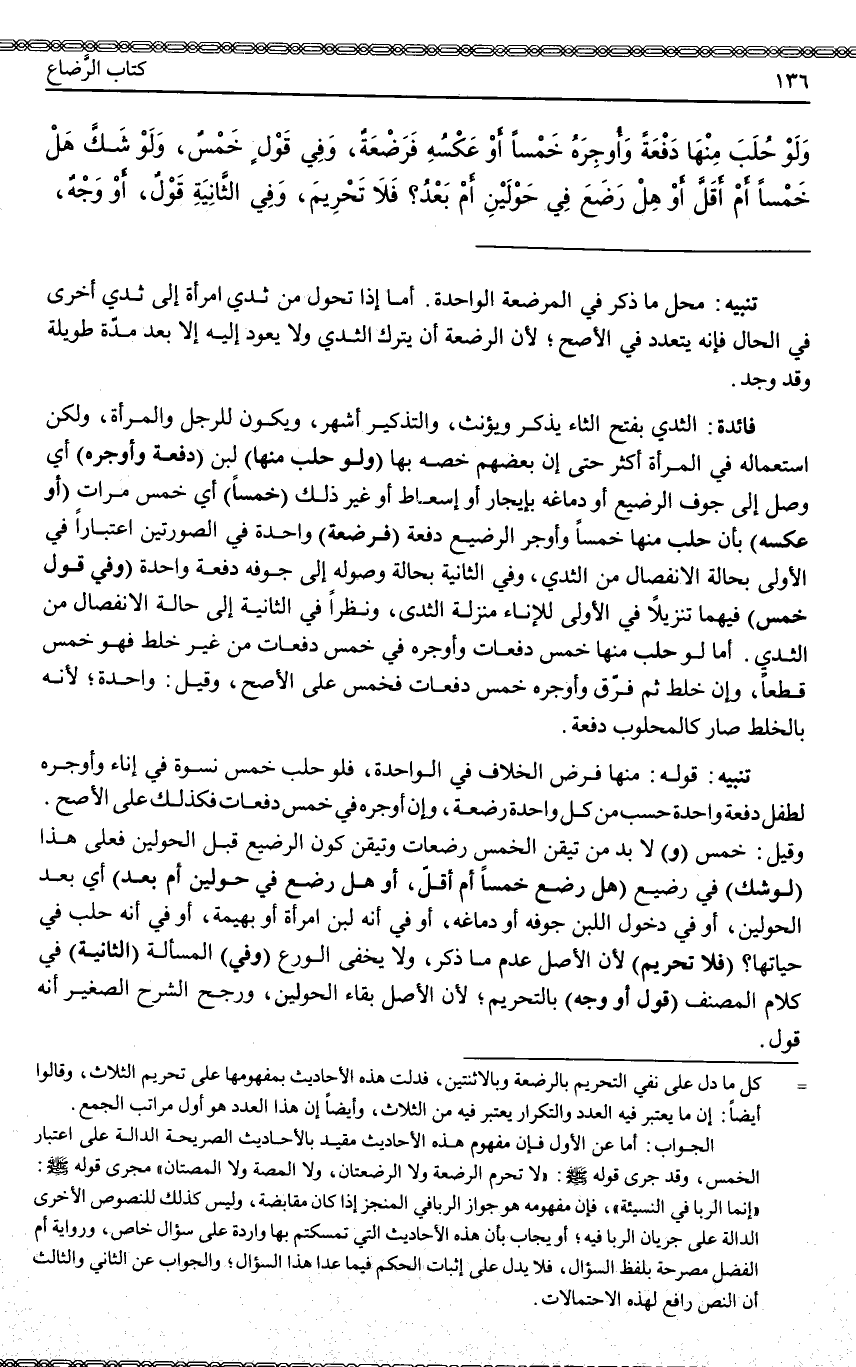 تَنْبِيهٌ قَوْلُهُ: مِنْهَا فَرَضَ الْخِلَافَ فِي الْوَاحِدَةِ، فَلَوْ حُلِبَ خَمْسُ نِسْوَةٍ فِي إنَاءٍ وَأُوجِرَهُ الطِّفْلُ دَفْعَةً وَاحِدَةً حُسِبَ مِنْ كُلِّ وَاحِدَةٍ رَضْعَةٌ، وَإِنْ أُوجِرَهُ فِي خَمْسِ دَفَعَاتٍ فَكَذَلِكَ عَلَى الْأَصَحِّ وَقِيلَ: خَمْسٌ (وَ) لَا بُدَّ مِنْ تَيَقُّنِ الْخَمْسِ رَضَعَاتٍ وَتَيَقُّنِ كَوْنِ الرَّضِيعِ قَبْلَ الْحَوْلَيْنِ فَعَلَى هَذَا (لَوْ شُكَّ) فِي رَضِيعٍ (هَلْ رَضَعَ خَمْسًا أَمْ أَقَلَّ، أَوْ هَلْ رَضَعَ فِي حَوْلَيْنِ أَمْ بَعْدُ) أَيْ بَعْدَ الْحَوْلَيْنِ، أَوْ فِي دُخُولِ اللَّبَنِ جَوْفَهُ أَوْ دِمَاغَهُ، أَوْ فِي أَنَّهُ لَبَنُ امْرَأَةٍ أَوْ بَهِيمَةٍ، أَوْ فِي أَنَّهُ حُلِبَ فِي حَيَاتِهَا؟ (فَلَا تَحْرِيمَ) لِأَنَّ الْأَصْلَ عَدَمُ مَا ذُكِرَ، وَلَا يَخْفَى الْوَرَعُ (وَفِي) الْمَسْأَلَةِ (الثَّانِيَةِ) فِي كَلَامِ الْمُصَنِّفِ (قَوْلٌ أَوْ وَجْهٌ) بِالتَّحْرِيمِ؛ لِأَنَّ الْأَصْلَ بَقَاءُ الْحَوْلَيْنِ، وَرَجَّحَ الشَّرْحُ الصَّغِيرُ أَنَّهُ قَوْلٌ