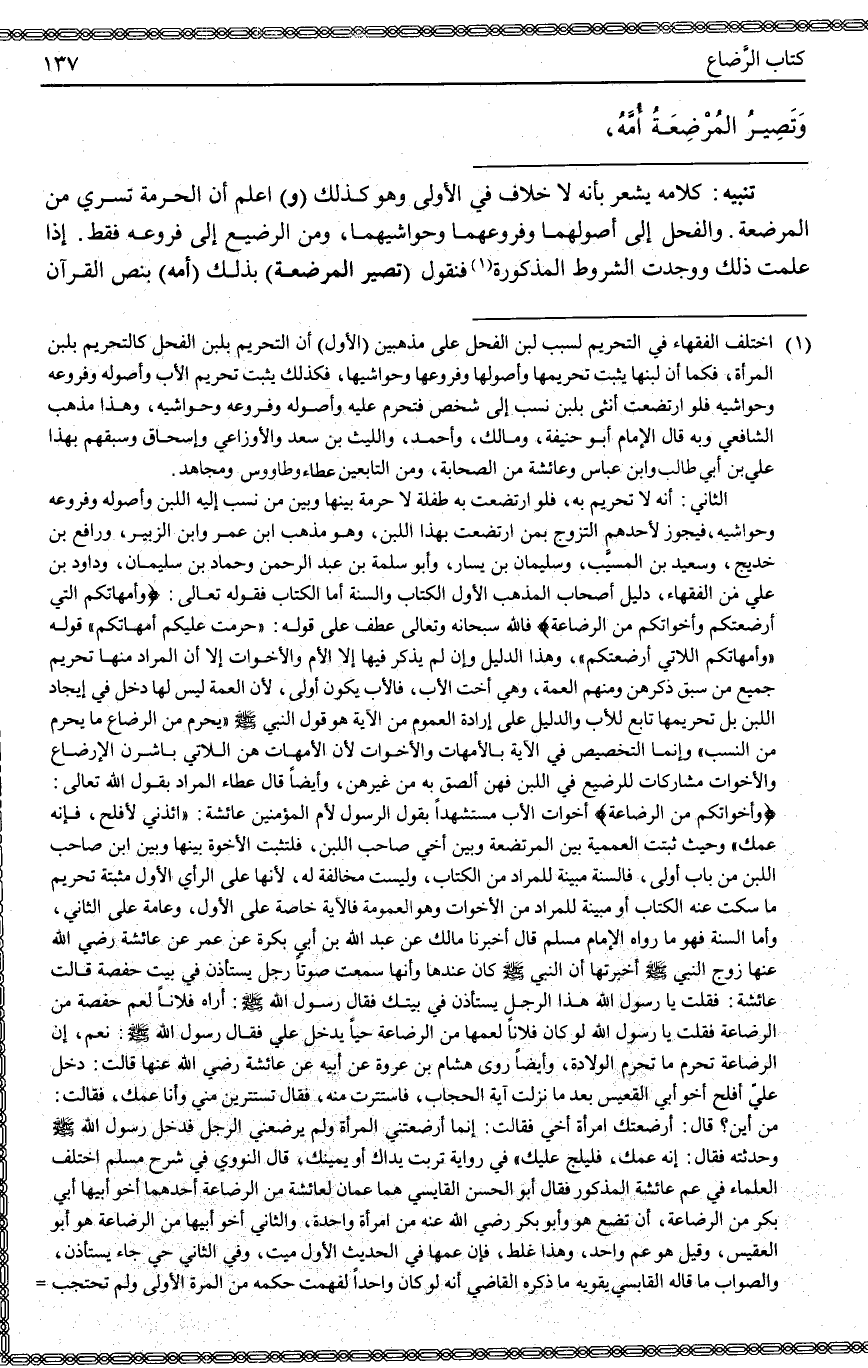ـــــــــــــــــــــــــــــQتَنْبِيهٌ كَلَامُهُ يُشْعِرُ بِأَنَّهُ لَا خِلَافَ فِي الْأُولَى وَهُوَ كَذَلِكَ (وَ) اعْلَمْ أَنَّ الْحُرْمَةَ تَسْرِي مِنْ الْمُرْضِعَةِ وَالْفَحْلِ إلَى أُصُولِهِمَا وَفُرُوعِهِمَا وَحَوَاشِيهِمَا، وَمِنْ الرَّضِيعِ إلَى فُرُوعِهِ فَقَطْ إذَا عَلِمْت ذَلِكَ وَوُجِدَتْ الشُّرُوطُ الْمَذْكُورَةُ فَنَقُولُ (تَصِيرُ الْمُرْضِعَةُ) بِذَلِكَ (أُمَّهُ) بِنَصِّ الْقُرْآنِ