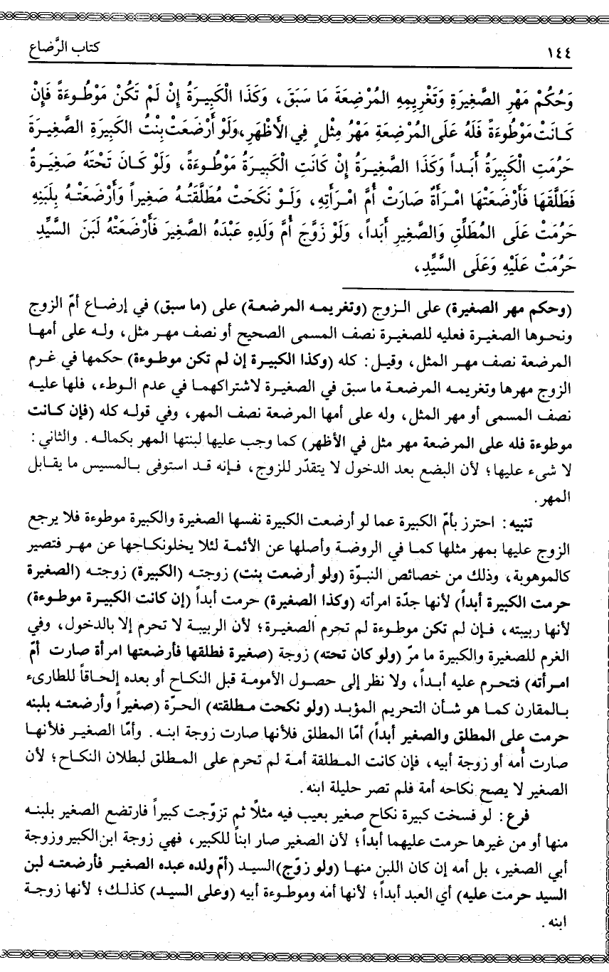 فَرْعٌ: لَوْ فَسَخَتْ كَبِيرَةٌ نِكَاحَ صَغِيرٍ بِعَيْبٍ فِيهِ مَثَلًا ثُمَّ تَزَوَّجَتْ كَبِيرًا فَارْتَضَعَ الصَّغِيرُ بِلَبَنِهِ مِنْهَا أَوْ مِنْ غَيْرِهَا حَرُمَتْ عَلَيْهِمَا أَبَدًا؛ لِأَنَّ الصَّغِيرَ صَارَ ابْنًا لِلْكَبِيرِ، فَهِيَ زَوْجَةُ ابْنِ الْكَبِيرِ وَزَوْجَةُ أَبِي الصَّغِيرِ، بَلْ أُمُّهُ إنْ كَانَ اللَّبَنُ مِنْهَا