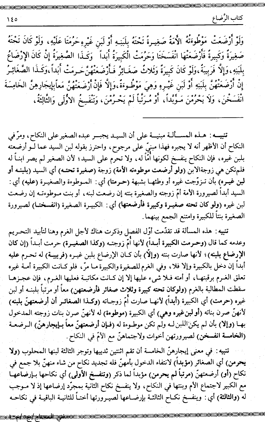 ـــــــــــــــــــــــــــــQتَنْبِيهٌ هَذِهِ الْمَسْأَلَةُ مَبْنِيَّةٌ عَلَى أَنَّ السَّيِّدَ يُجْبِرُ عَبْدَهُ الصَّغِيرَ عَلَى النِّكَاحِ، وَمَرَّ فِي النِّكَاحِ أَنَّ الْأَظْهَرَ أَنَّهُ لَا يُجْبِرُهُ فَهَذَا مَبْنِيٌّ عَلَى مَرْجُوحٍ، وَاحْتَرَزَ بِقَوْلِ: لَبَنَ السَّيِّدِ، عَمَّا لَوْ أَرْضَعَتْهُ بِلَبَنِ غَيْرِهِ، فَإِنَّ النِّكَاحَ يَنْفَسِخُ لِكَوْنِهَا أُمًّا لَهُ، وَلَا تَحْرُمُ عَلَى السَّيِّدِ؛ لِأَنَّ الصَّغِيرَ لَمْ يَصِرْ ابْنًا لَهُ فَلَمْ تَكُنْ هِيَ زَوْجَةَ الِابْنِ (وَلَوْ أَرْضَعَتْ مَوْطُوءَتُهُ الْأَمَةُ) زَوْجَةً (صَغِيرَةً تَحْتَهُ) أَيْ السَّيِّدِ (بِلَبَنِهِ أَوْ لَبَنِ غَيْرِهِ) بِأَنْ تَزَوَّجَتْ غَيْرَهُ أَوْ وَطِئَهَا بِشُبْهَةٍ (حَرُمَتَا) أَيْ: الْمَوْطُوءَةُ وَالصَّغِيرَةُ (عَلَيْهِ) أَيْ: السَّيِّدِ أَبَدًا لِصَيْرُورَةِ الْأَمَةِ أُمَّ زَوْجَتِهِ وَالصَّغِيرَةِ بِنْتَهُ إنْ رَضَعَتْ لَبَنَهُ، أَوْ بِنْتَ مَوْطُوءَتِهِ إنْ رَضَعَتْ لَبَنَ غَيْرِهِ