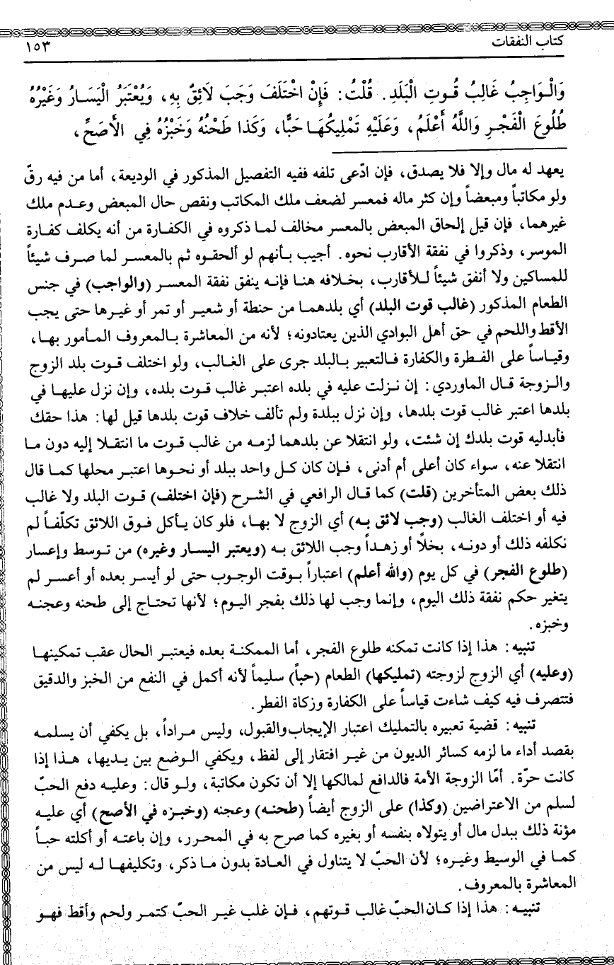 (وَالْوَاجِبُ) فِي جِنْسِ الطَّعَامِ الْمَذْكُورِ (غَالِبُ قُوتِ الْبَلَدِ) أَيْ بَلَدِهِمَا مِنْ حِنْطَةٍ أَوْ شَعِيرٍ أَوْ تَمْرٍ أَوْ غَيْرِهَا حَتَّى يَجِبَ الْأَقِطُ وَاللَّحْمُ فِي حَقِّ أَهْلِ الْبَوَادِي الَّذِينَ يَعْتَادُونَهُ؛ لِأَنَّهُ مِنْ الْمُعَاشَرَةِ بِالْمَعْرُوفِ الْمَأْمُورِ بِهَا، وَقِيَاسًا عَلَى الْفِطْرَةِ وَالْكَفَّارَةِ فَالتَّعْبِيرُ بِالْبَلَدِ جَرَى عَلَى الْغَالِبِ وَلَوْ اخْتَلَفَ قُوتُ بَلَدِ الزَّوْجِ وَالزَّوْجَةِ قَالَ الْمَاوَرْدِيُّ: إنْ نَزَلَتْ عَلَيْهِ فِي بَلَدِهِ اُعْتُبِرَ غَالِبُ قُوتِ بَلَدِهِ، وَإِنْ نَزَلَ عَلَيْهَا فِي بَلَدِهَا اُعْتُبِرَ غَالِبُ قُوتِ بَلَدِهَا، وَإِنْ نَزَلَ بِبَلْدَةٍ وَلَمْ تَأْلَفَ خِلَافَ قُوتِ بَلَدِهَا قِيلَ لَهَا: هَذَا حَقُّكِ فَأَبْدِلِيهِ قُوتَ بَلَدِكِ إنْ شِئْتِ، وَلَوْ انْتَقَلَا عَنْ بَلَدِهِمَا لَزِمَهُ مِنْ غَالِبِ قُوتِ مَا انْتَقَلَا إلَيْهِ دُونَ مَا انْتَقَلَا عَنْهُ، سَوَاءٌ كَانَ أَعْلَى أَمْ أَدْنَى، فَإِنْ كَانَ كُلُّ وَاحِدٍ بِبَلَدٍ أَوْ نَحْوِهَا اُعْتُبِرَ مَحَلُّهَا كَمَا قَالَ ذَلِكَ بَعْضُ الْمُتَأَخِّرِينَ (قُلْت) كَمَا قَالَ الرَّافِعِيُّ فِي الشَّرْحِ (فَإِنْ اخْتَلَفَ) قُوتُ الْبَلَدِ وَلَا غَالِبَ فِيهِ أَوْ اخْتَلَفَ الْغَالِبُ (وَجَبَ لَائِقٌ بِهِ) أَيْ الزَّوْجِ لَا بِهَا، فَلَوْ كَانَ يَأْكُلُ فَوْقَ اللَّائِقِ تَكَلُّفًا لَمْ نُكَلِّفْهُ ذَلِكَ أَوْ دُونَهُ، بُخْلًا أَوْ زُهْدًا وَجَبَ اللَّائِقُ بِهِ (وَيُعْتَبَرُ الْيَسَارُ وَغَيْرُهُ) مِنْ تَوَسُّطٍ وَإِعْسَارٍ (طُلُوعَ الْفَجْرِ) فِي كُلِّ يَوْمٍ (وَاَللَّهُ أَعْلَمُ) اعْتِبَارًا بِوَقْتِ الْوُجُوبِ حَتَّى لَوْ أَيْسَرَ بَعْدَهُ أَوْ أَعْسَرَ لَمْ يَتَغَيَّرْ حُكْمُ نَفَقَةِ ذَلِكَ الْيَوْمِ، وَإِنَّمَا وَجَبَ لَهَا ذَلِكَ بِفَجْرِ الْيَوْمِ؛ لِأَنَّهَا تَحْتَاجُ إلَى طَحْنِهِ وَعَجْنِهِ وَخَبْزِهِ.