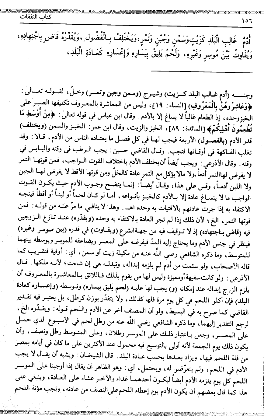 ـــــــــــــــــــــــــــــQوَجِنْسُهُ (أُدْمُ غَالِبِ الْبَلَدِ كَزَيْتٍ) وَشَيْرَجٍ (وَسَمْنٍ وَجُبْنٍ وَتَمْرٍ) وَخَلٍّ، لِقَوْلِهِ تَعَالَى: {وَعَاشِرُوهُنَّ بِالْمَعْرُوفِ} [النساء: 19] ، وَلَيْسَ مِنْ الْمُعَاشَرَةِ بِالْمَعْرُوفِ تَكْلِيفُهَا الصَّبْرَ عَلَى الْخُبْزِ وَحْدَهُ، إذْ الطَّعَامُ غَالِبًا لَا يُسَاغُ إلَّا بِالْأُدْمِ. وَقَالَ ابْنُ عَبَّاسٍ فِي قَوْله تَعَالَى: {مِنْ أَوْسَطِ مَا تُطْعِمُونَ أَهْلِيكُمْ} [المائدة: 89] ، الْخُبْزُ وَالزَّيْتُ، وَقَالَ ابْنُ عُمَرَ: الْخُبْزُ وَالسَّمْنُ (وَيَخْتَلِفُ) قَدْرُ الْأُدْمِ (بِالْفُصُولِ) الْأَرْبَعَةِ فَيَجِبُ لَهَا فِي كُلِّ فَصْلٍ مَا يَعْتَادُهُ النَّاسُ مِنْ الْأُدْمِ، قَالَا: وَقَدْ تَغْلِبُ الْفَاكِهَةُ فِي أَوْقَاتِهَا فَتَجِبُ. وَقَالَ الْقَاضِي حُسَيْنٌ: يَجِبُ الرَّطْبُ فِي وَقْتِهِ وَالْيَابِسُ فِي وَقْتِهِ. وَقَالَ الْأَذْرَعِيُّ: وَيَجِبُ أَيْضًا أَنْ يَخْتَلِفَ الْأُدْمُ بِاخْتِلَافِ الْقُوتِ الْوَاجِبِ، فَمَنْ قُوتُهَا التَّمْرُ لَا يُفْرَضُ لَهَا التَّمْرُ أُدْمًا، وَلَا مَا لَا يُؤْكَلُ مَعَ التَّمْرِ عَادَةً كَالْخَلِّ وَمَنْ قُوتُهَا الْأَقِطُ لَا يُفْرَضُ لَهَا الْجُبْنُ وَلَا اللَّبَنُ أُدْمًا، وَقِسْ عَلَى هَذَا، وَقَالَ أَيْضًا: إنَّمَا يَتَّضِحُ وُجُوبُ الْأُدْمِ حَيْثُ يَكُونُ الْقُوتُ الْوَاجِبُ مَا لَا يَنْسَاغُ عَادَةً إلَّا بِالْأُدْمِ كَالْخُبْزِ بِأَنْوَاعِهِ، أَمَّا لَوْ كَانَ لَحْمًا أَوْ لَبَنًا أَوْ أَقِطًا فَيُتَّجَهُ الِاكْتِفَاءُ بِهِ إذَا جَرَتْ عَادَتُهُمْ بِالِاقْتِيَاتِ بِهِ وَحْدَهُ اهـ.