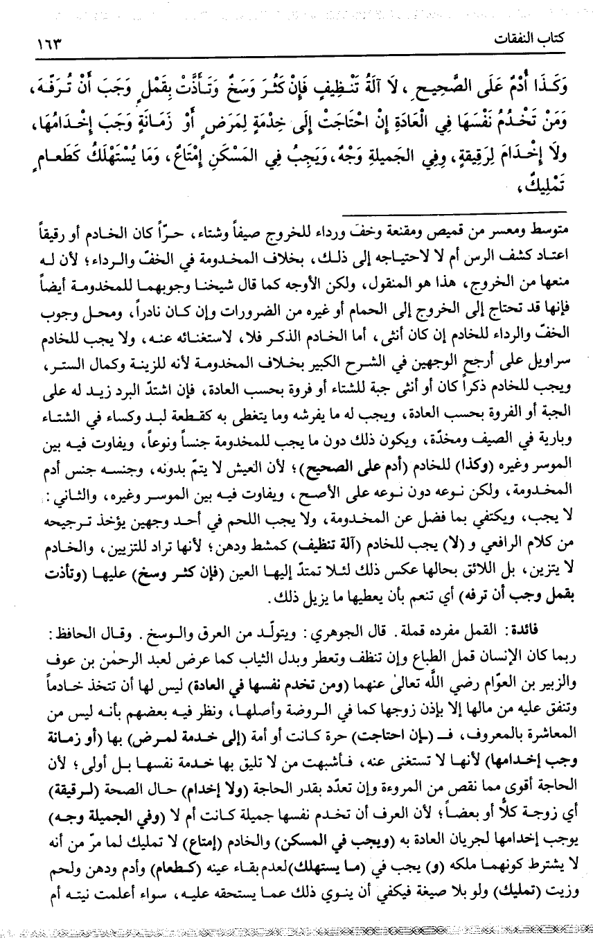 (وَمَنْ تَخْدُمُ نَفْسَهَا فِي الْعَادَةِ) لَيْسَ لَهَا أَنْ تَتَّخِذَ خَادِمًا وَتُنْفِقَ عَلَيْهِ مِنْ مَالِهَا إلَّا بِإِذْنِ زَوْجِهَا كَمَا فِي الرَّوْضَةِ وَأَصْلِهَا، وَنَظَرَ فِيهِ بَعْضُهُمْ بِأَنَّهُ لَيْسَ مِنْ الْمُعَاشَرَةِ بِالْمَعْرُوفِ، فَ (إنْ احْتَاجَتْ) حُرَّةً كَانَتْ أَوْ أَمَةً (إلَى خِدْمَةٍ لِمَرَضٍ) بِهَا (أَوْ زَمَانَةٍ وَجَبَ إخْدَامُهَا) لِأَنَّهَا لَا تَسْتَغْنِي عَنْهُ، فَأَشْبَهَتْ مَنْ لَا تَلِيقُ بِهَا خِدْمَةُ نَفْسِهَا بَلْ أَوْلَى؛ لِأَنَّ الْحَاجَةَ أَقْوَى مِمَّا نَقَصَ مِنْ الْمُرُوءَةِ وَإِنْ تَعَدَّدَ بِقَدْرِ الْحَاجَةِ (وَلَا إخْدَامَ) حَالَ الصِّحَّةِ (لِرَقِيقَةٍ) أَيْ زَوْجَةٍ كُلًّا أَوْ بَعْضًا؛ لِأَنَّ الْعُرْفَ أَنْ تَخْدُمَ نَفْسَهَا جَمِيلَةً كَانَتْ أَمْ لَا (وَفِي الْجَمِيلَةِ وَجْهٌ) يُوجِبُ إخْدَامَهَا لِجَرَيَانِ الْعَادَةِ بِهِ.