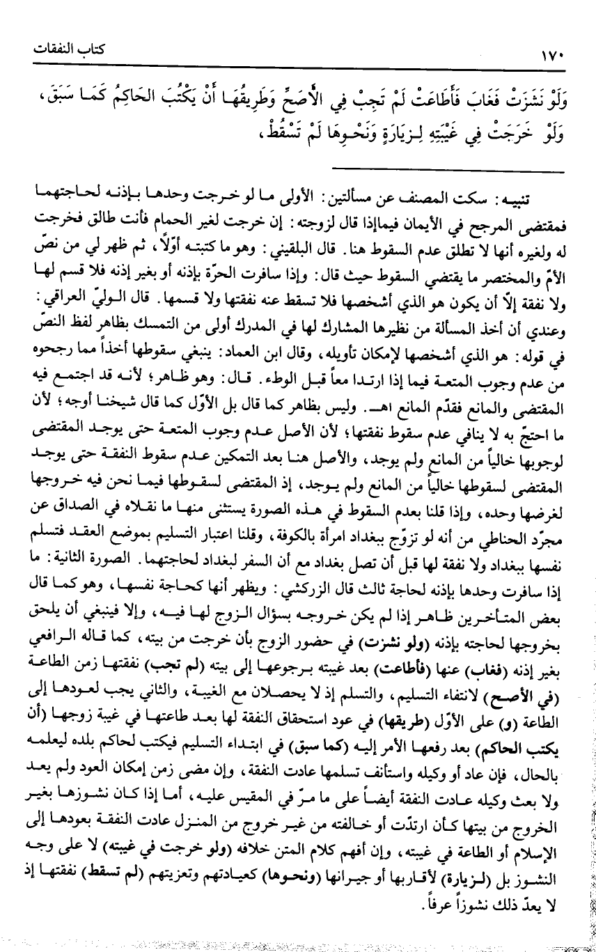 ـــــــــــــــــــــــــــــQتَنْبِيهٌ: سَكَتَ الْمُصَنِّفُ عَنْ مَسْأَلَتَيْنِ: الْأُولَى مَا لَوْ خَرَجَتْ وَحْدَهَا بِإِذْنِهِ لِحَاجَتِهِمَا فَمُقْتَضَى الْمُرَجَّحِ فِي الْأَيْمَانِ فِيمَا إذَا قَالَ لِزَوْجَتِهِ: إنْ خَرَجْت لِغَيْرِ الْحَمَّامِ فَأَنْتِ طَالِقٌ فَخَرَجَتْ لَهُ وَلِغَيْرِهِ أَنَّهَا لَا تَطْلُقُ عَدَمُ السُّقُوطِ هُنَا. قَالَ الْبُلْقِينِيُّ: وَهُوَ مَا كَتَبْتُهُ أَوَّلًا، ثُمَّ ظَهَرَ لِي مِنْ نَصِّ الْأُمِّ وَالْمُخْتَصَرِ مَا يَقْتَضِي السُّقُوطَ حَيْثُ قَالَ: وَإِذَا سَافَرَتْ الْحُرَّةُ بِإِذْنِهِ أَوْ بِغَيْرِ إذْنِهِ فَلَا قَسَمَ لَهَا وَلَا نَفَقَةَ إلَّا أَنْ يَكُونَ هُوَ الَّذِي أَشْخَصَهَا فَلَا تَسْقُطُ عَنْهُ نَفَقَتُهَا وَلَا قَسَمُهَا. قَالَ الْوَلِيُّ الْعِرَاقِيُّ: وَعِنْدِي أَنَّ أَخْذَ الْمَسْأَلَةِ مِنْ نَظِيرِهَا الْمُشَارِكِ لَهَا فِي الْمُدْرَكِ أَوْلَى مِنْ التَّمَسُّكِ بِظَاهِرِ لَفْظِ النَّصِّ فِي قَوْلِهِ: هُوَ الَّذِي أَشْخَصَهَا لِإِمْكَانِ تَأْوِيلِهِ، وَقَالَ ابْنُ الْعِمَادِ: يَنْبَغِي سُقُوطُهَا أَخْذًا مِمَّا رَجَّحُوهُ مِنْ عَدَمِ وُجُوبِ الْمُتْعَةِ فِيمَا إذَا ارْتَدَّا مَعًا قَبْلَ الْوَطْءِ. قَالَ: وَهُوَ ظَاهِرٌ؛ لِأَنَّهُ قَدْ اجْتَمَعَ فِيهِ الْمُقْتَضِي وَالْمَانِعُ فَقُدِّمَ الْمَانِعُ اهـ.