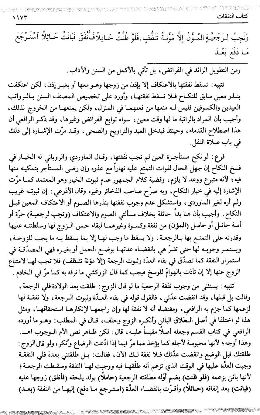 تَنْبِيهٌ: يُسْتَثْنَى مِنْ وُجُوبِ نَفَقَةِ الرَّجْعِيَّةِ مَا لَوْ قَالَ الزَّوْجُ: طَلَّقْتُ بَعْدَ الْوِلَادَةِ فَلِيَ الرَّجْعَةُ، وَقَالَتْ بَلْ قَبْلَهَا، وَقَدْ انْقَضَتْ عِدَّتِي، فَالْقَوْلُ قَوْلُهُ فِي بَقَاءِ الْعِدَّةِ وَثُبُوتِ الرَّجْعَةِ، وَلَا نَفَقَةَ لَهَا لِزَعْمِهَا كَمَا جَزَمَ بِهِ الرَّافِعِيُّ، وَمُقْتَضَاهُ أَنَّهُ لَا نَفَقَةَ لَهَا وَإِنْ رَاجَعَهَا لِإِنْكَارِهَا اسْتِحْقَاقَهَا، وَمِثْلُ هَذَا لَوْ اخْتَلَفَا فِي أَصْلِ الطَّلَاقِ الْبَائِنِ وَأَنْكَرَهُ الزَّوْجُ وَحَلَفَ، قَالَ فِي الْمَطْلَبِ: وَهُوَ مَا أَوْرَدَهُ الرَّافِعِيُّ فِي كِتَابِ الْقَسَمِ وَجَعَلَهُ أَصْلًا مَقِيسًا عَلَيْهِ، قَالَ: لَكِنْ ظَاهِرُ نَصِّ الْأُمِّ الْوُجُوبُ اهـ.