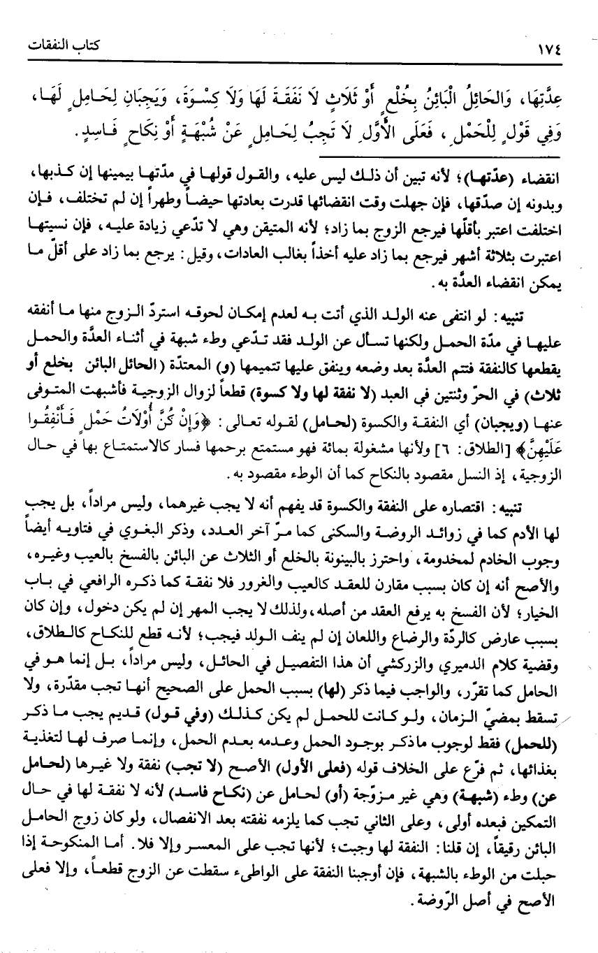 تَنْبِيهٌ: اقْتِصَارُهُ عَلَى النَّفَقَةِ وَالْكِسْوَةِ قَدْ يُفْهِمُ أَنَّهُ لَا يَجِبُ غَيْرُهُمَا، وَلَيْسَ مُرَادًا، بَلْ يَجِبُ لَهَا الْأُدْمُ كَمَا فِي زَوَائِدِ الرَّوْضَةِ وَالسُّكْنَى كَمَا مَرَّ آخِرَ الْعَدَدِ، وَذَكَرَ الْبَغَوِيّ فِي فَتَاوِيهِ أَيْضًا وُجُوبَ الْخَادِمِ لِمَخْدُومَةٍ، وَاحْتُرِزَ بِالْبَيْنُونَةِ بِالْخُلْعِ أَوْ الثَّلَاثِ عَنْ الْبَائِنِ بِالْفَسْخِ بِالْعَيْبِ وَغَيْرِهِ، وَالْأَصَحُّ أَنَّهُ إنْ كَانَ بِسَبَبٍ مُقَارِنٍ لِلْعَقْدِ كَالْعَيْبِ وَالْغُرُورِ فَلَا نَفَقَةَ كَمَا ذَكَرَهُ الرَّافِعِيُّ فِي بَابِ الْخِيَارِ؛ لِأَنَّ الْفَسْخَ بِهِ يَرْفَعُ الْعَقْدَ مِنْ أَصْلِهِ، وَلِذَلِكَ لَا يَجِبُ الْمَهْرُ إنْ لَمْ يَكُنْ دُخُولٌ، وَإِنْ كَانَ بِسَبَبٍ عَارِضٍ كَالرِّدَّةِ وَالرَّضَاعِ وَاللِّعَانِ إنْ لَمْ يَنْفِ الْوَلَدَ فَيَجِبُ؛ لِأَنَّهُ قُطِعَ لِلنِّكَاحِ كَالطَّلَاقِ، وَقَضِيَّةُ كَلَامِ الدَّمِيرِيِّ وَالزَّرْكَشِيِّ أَنْ هَذَا التَّفْصِيلَ فِي الْحَائِلِ، وَلَيْسَ مُرَادًا، بَلْ إنَّمَا هُوَ فِي الْحَامِلِ كَمَا تَقَرَّرَ، وَالْوَاجِبُ فِيمَا ذُكِرَ (لَهَا) بِسَبَبِ الْحَمْلِ عَلَى الصَّحِيحِ أَنَّهَا تَجِبُ مُقَدَّرَةً، وَلَا تَسْقُطُ بِمُضِيِّ الزَّمَانِ، وَلَوْ كَانَتْ لِلْحَمْلِ لَمْ يَكُنْ كَذَلِكَ (وَفِي قَوْلٍ) قَدِيمٍ يَجِبُ مَا ذُكِرَ (لِلْحَمْلِ) فَقَطْ لِوُجُوبِ مَا ذُكِرَ بِوُجُودِ الْحَمْلِ وَعَدَمِهِ بِعَدَمِ الْحَمْلِ، وَإِنَّمَا صُرِفَ لَهَا لِتُغَذِّيَهُ بِغِذَائِهَا، ثُمَّ فَرَّعَ عَلَى الْخِلَافِ قَوْلَهُ (فَعَلَى الْأَوَّلِ) الْأَصَحُّ (لَا تَجِبُ) نَفَقَةٌ وَلَا غَيْرُهَا (لِحَامِلٍ عَنْ) وَطْءِ (شُبْهَةٍ) وَهِيَ غَيْرُ مُزَوَّجَةٍ (أَوْ) لِحَامِلٍ عَنْ (نِكَاحٍ فَاسِدٍ) لِأَنَّهُ لَا نَفَقَةَ لَهَا فِي حَالِ التَّمْكِينِ فَبَعْدَهُ أَوْلَى، وَعَلَى الثَّانِي تَجِبُ كَمَا يَلْزَمُهُ نَفَقَتُهُ بَعْدَ الِانْفِصَالِ، وَلَوْ كَانَ زَوْجُ الْحَامِلِ الْبَائِنِ رَقِيقًا، إنْ قُلْنَا: النَّفَقَةُ لَهَا وَجَبَتْ؛ لِأَنَّهَا تَجِبُ عَلَى الْمُعْسِرِ وَإِلَّا فَلَا.