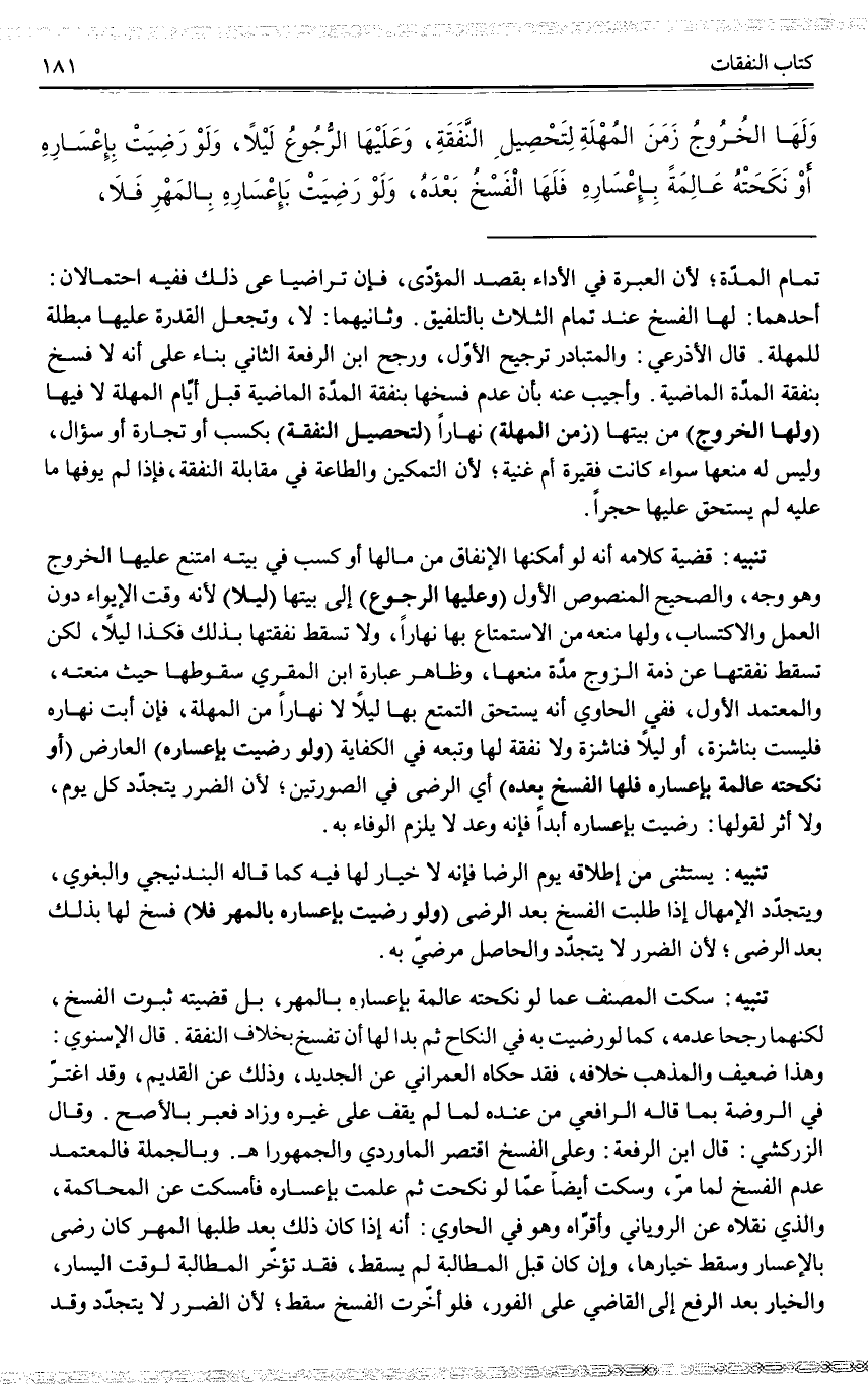 تَنْبِيهٌ: سَكَتَ الْمُصَنِّفُ عَمَّا لَوْ نَكَحَتْهُ عَالِمَةً بِإِعْسَارِهِ بِالْمَهْرِ، بَلْ قَضِيَّتُهُ ثُبُوتُ الْفَسْخِ، لَكِنَّهُمَا رَجَّحَا عَدَمَهُ، كَمَا لَوْ رَضِيَتْ بِهِ فِي النِّكَاحِ ثُمَّ بَدَا لَهَا أَنْ تَفْسَخَ بِخِلَافِ النَّفَقَةِ. قَالَ الْإِسْنَوِيُّ: وَهَذَا ضَعِيفٌ وَالْمَذْهَبُ خِلَافُهُ، فَقَدْ حَكَاهُ الْعِمْرَانِيُّ عَنْ الْجَدِيدِ، وَذَلِكَ عَنْ الْقَدِيمِ، وَقَدْ اغْتَرَّ فِي الرَّوْضَةِ بِمَا قَالَهُ الرَّافِعِيُّ مِنْ عِنْدِهِ لَمَّا لَمْ يَقِفْ عَلَى غَيْرِهِ وَزَادَ فَعَبَّرَ بِالْأَصَحِّ. وَقَالَ الزَّرْكَشِيُّ: قَالَ ابْنُ الرِّفْعَةِ: وَعَلَى الْفَسْخِ اقْتَصَرَ الْمَاوَرْدِيُّ وَالْجُمْهُورُ اهـ.