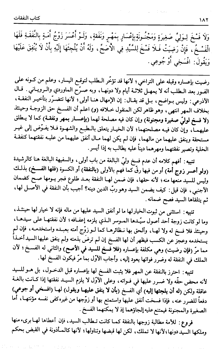 تَنْبِيهٌ: اُحْتُرِزَ بِالنَّفَقَةِ عَنْ الْمَهْرِ فَلَا يَثْبُتُ الْفَسْخُ لَهَا بِإِعْسَارِهِ قَبْلَ الدُّخُولِ، بَلْ هُوَ لِلسَّيِّدِ لِأَنَّهُ مَحْضُ حَقِّهِ وَلَا ضَرَرَ عَلَيْهَا فِي فَوَاتِهِ، وَعَلَى الْأَوَّلِ لَا يَلْزَمُ السَّيِّدُ نَفَقَتَهَا إذَا كَانَتْ بَالِغَةً عَاقِلَةً وَلَكِنْ (لَهُ أَنْ يُلْجِئَهَا إلَيْهِ) أَيْ الْفَسْخِ (بِأَنْ لَا يُنْفِقَ عَلَيْهَا وَيَقُولَ) لَهَا (افْسَخِي أَوْ جُوعِي) دَفْعًا لِلضَّرَرِ عَنْهُ، فَإِذَا فَسَخَتْ أَنْفَقَ عَلَيْهَا وَاسْتَمْتَعَ بِهَا أَوْ زَوَّجَهَا مِنْ غَيْرِهِ كَفَى نَفْسَهُ مُؤْنَتَهَا، أَمَّا الصَّغِيرَةُ وَالْمَجْنُونَةُ فَيَمْتَنِعُ عَلَيْهِ إلْجَاؤُهُمَا إذْ لَا يُمْكِنُهُمَا الْفَسْخُ. فُرُوعٌ: لِلْأَمَةِ مُطَالَبَةُ زَوْجِهَا بِالنَّفَقَةِ كَمَا كَانَتْ تُطَالِبُ السَّيِّدَ، فَإِنْ أَعْطَاهَا لَهَا بَرِئَ مِنْهَا وَمَلَكَهَا السَّيِّدُ دُونَهَا؛ لِأَنَّهَا لَا تَمْلِكُ، لَكِنْ لَهَا قَبْضُهَا وَتَنَاوُلُهَا؛ لِأَنَّهَا كَالْمَأْذُونَةِ فِي الْقَبْضِ بِحُكْمِ