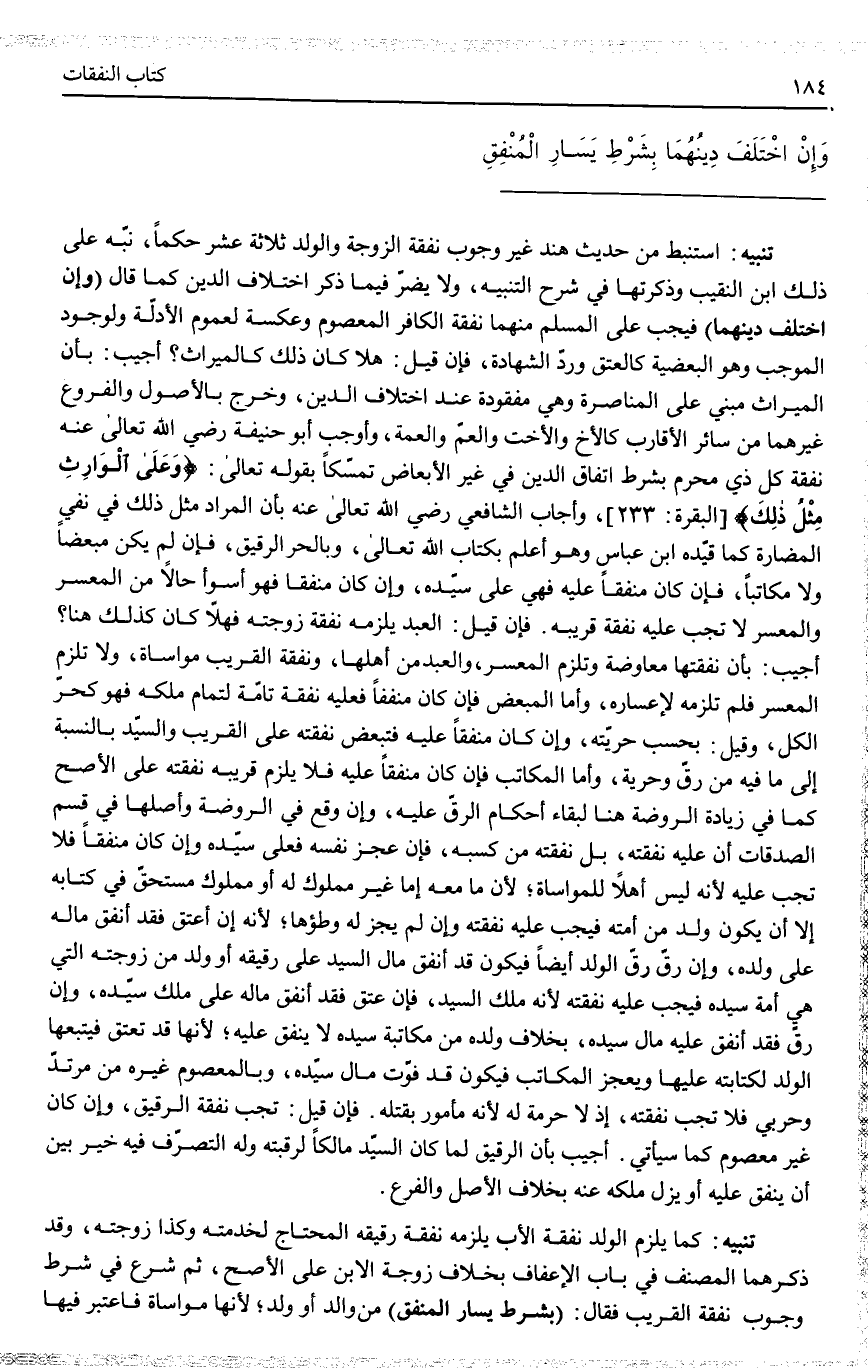 ـــــــــــــــــــــــــــــQتَنْبِيهٌ: اُسْتُنْبِطَ مِنْ حَدِيثِ هِنْدٍ غَيْرَ وُجُوبِ نَفَقَةِ الزَّوْجَةِ وَالْوَلَدِ ثَلَاثَةَ عَشَرَ حُكْمًا، نَبَّهَ عَلَى ذَلِكَ ابْنُ النَّقِيبِ وَذَكَرْتهَا فِي شَرْحِ التَّنْبِيهِ، وَلَا يَضُرُّ فِيمَا ذُكِرَ اخْتِلَافُ الدِّينِ كَمَا قَالَ (وَإِنْ اخْتَلَفَ دِينُهُمَا) فَيَجِبُ عَلَى الْمُسْلِمِ مِنْهُمَا نَفَقَةُ الْكَافِرِ الْمَعْصُومِ وَعَكْسُهُ لِعُمُومِ الْأَدِلَّةِ وَلِوُجُودِ الْمُوجِبِ وَهُوَ الْبَعْضِيَّةُ كَالْعِتْقِ وَرَدِّ الشَّهَادَةِ، فَإِنْ قِيلَ: هَلَّا كَانَ ذَلِكَ كَالْمِيرَاثِ؟ .