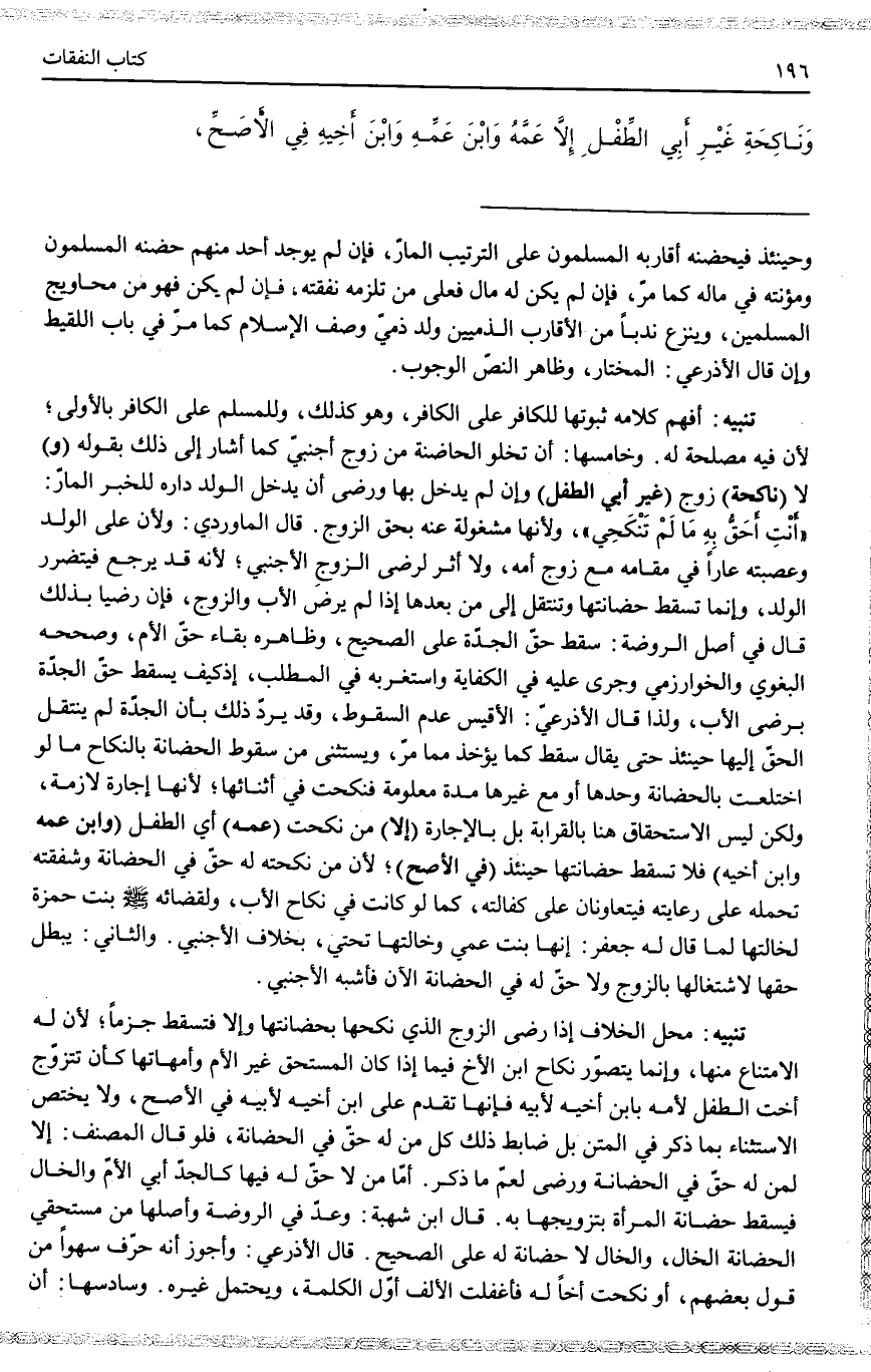 لَهُ. وَخَامِسُهَا: أَنْ تَخْلُوَ الْحَاضِنَةُ مِنْ زَوْجٍ أَجْنَبِيٍّ كَمَا أَشَارَ إلَى ذَلِكَ بِقَوْلِهِ (وَ) لَا (نَاكِحَةِ) زَوْجٍ (غَيْرِ أَبِي الطِّفْلِ) وَإِنْ لَمْ يَدْخُلْ بِهَا وَرَضِيَ أَنْ يَدْخُلَ الْوَلَدُ دَارِهِ لِلْخَبَرِ الْمَارِّ: " أَنْتِ أَحَقُّ بِهِ مَا لَمْ تَنْكِحِي "، وَلِأَنَّهَا مَشْغُولَةٌ عَنْهُ بِحَقِّ الزَّوْجِ. قَالَ الْمَاوَرْدِيُّ: وَلِأَنَّ عَلَى الْوَلَدِ وَعَصَبَتِهِ عَارًا فِي مُقَامِهِ مَعَ زَوْجِ أُمِّهِ، وَلَا أَثَرَ لِرِضَا الزَّوْجِ الْأَجْنَبِيِّ؛ لِأَنَّهُ قَدْ يَرْجِعُ فَيَتَضَرَّرُ الْوَلَدُ، وَإِنَّمَا تَسْقُطُ حَضَانَتُهَا وَتَنْتَقِلُ إلَى مَنْ بَعْدَهَا إذَا لَمْ يَرْضَ الْأَبُ وَالزَّوْجُ، فَإِنْ رَضِيَا بِذَلِكَ قَالَ فِي أَصْلِ الرَّوْضَةِ: سَقَطَ حَقُّ الْجَدَّةِ عَلَى الصَّحِيحِ، وَظَاهِرُهُ بَقَاءُ حَقِّ الْأُمِّ، وَصَحَّحَهُ الْبَغَوِيّ وَالْخُوَارِزْمِيّ وَجَرَى عَلَيْهِ فِي الْكِفَايَةِ وَاسْتَغْرَبَهُ فِي الْمَطْلَبِ، إذْ كَيْفَ يَسْقُطُ حَقُّ الْجَدَّةِ بِرِضَا الْأَبِ؟ ، وَلِذَا قَالَ الْأَذْرَعِيُّ: الْأَقْيَسُ عَدَمُ السُّقُوطِ، وَقَدْ يُرَدُّ ذَلِكَ بِأَنَّ الْجَدَّةَ لَمْ يَنْتَقِلْ الْحَقُّ إلَيْهَا حِينَئِذٍ حَتَّى يُقَالَ سَقَطَ كَمَا يُؤْخَذُ مِمَّا مَرَّ، وَيُسْتَثْنَى مِنْ سُقُوطِ الْحَضَانَةِ بِالنِّكَاحِ مَا لَوْ اخْتَلَعَتْ بِالْحَضَانَةِ وَحْدَهَا أَوْ مَعَ غَيْرِهَا مُدَّةً مَعْلُومَةً فَنَكَحَتْ فِي أَثْنَائِهَا؛ لِأَنَّهَا إجَارَةٌ لَازِمَةٌ، وَلَكِنْ لَيْسَ الِاسْتِحْقَاقُ هُنَا بِالْقَرَابَةِ بَلْ بِالْإِجَارَةِ (إلَّا) مَنْ نَكَحَتْ (عَمَّهُ) أَيْ الطِّفْلِ (وَابْنَ عَمِّهِ وَابْنَ أَخِيهِ) فَلَا تَسْقُطُ حَضَانَتُهَا حِينَئِذٍ (فِي الْأَصَحِّ) ؛ لِأَنَّ مَنْ نَكَحَتْهُ لَهُ حَقٌّ فِي الْحَضَانَةِ وَشَفَقَتُهُ تَحْمِلُهُ عَلَى رِعَايَتِهِ فَيَتَعَاوَنَانِ عَلَى كَفَالَتِهِ، كَمَا لَوْ كَانَتْ فِي نِكَاحِ الْأَبِ، وَلِقَضَائِهِ - صَلَّى اللَّهُ عَلَيْهِ وَسَلَّمَ - بِنْتَ حَمْزَةَ لِخَالَتِهَا لَمَّا قَالَ لَهُ جَعْفَرٌ: إنَّهَا بِنْتُ عَمِّي وَخَالَتُهَا تَحْتِي، بِخِلَافِ الْأَجْنَبِيِّ. وَالثَّانِي: يَبْطُلُ حَقُّهَا لِاشْتِغَالِهَا بِالزَّوْجِ وَلَا حَقَّ لَهُ فِي الْحَضَانَةِ الْآنَ فَأَشْبَهَ الْأَجْنَبِيَّ.