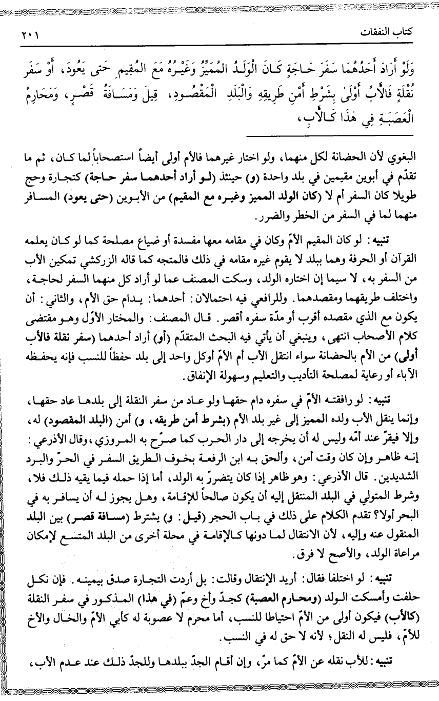 تَنْبِيهٌ: لَوْ كَانَ الْمُقِيمُ الْأُمَّ وَكَانَ فِي مُقَامِهِ مَعَهَا مَفْسَدَةٌ أَوْ ضَيَاعُ مَصْلَحَةٍ كَمَا لَوْ كَانَ يُعَلِّمُهُ الْقُرْآنَ أَوْ الْحِرْفَةَ وَهُمَا بِبَلَدٍ لَا يَقُومُ غَيْرُهُ مَقَامَهُ فِي ذَلِكَ فَالْمُتَّجَهُ كَمَا قَالَهُ الزَّرْكَشِيُّ تَمْكِينُ الْأَبِ مِنْ السَّفَرِ بِهِ، لَا سِيَّمَا إنْ اخْتَارَهُ الْوَلَدُ، وَسَكَتَ الْمُصَنِّفُ عَمَّا لَوْ أَرَادَ كُلٌّ مِنْهُمَا السَّفَرَ لِحَاجَةٍ، وَاخْتَلَفَ طَرِيقُهُمَا وَمَقْصِدُهُمَا. وَلِلرَّافِعِيِّ فِيهِ احْتِمَالَانِ: أَحَدُهُمَا: يُدَامُ حَقُّ الْأُمِّ، وَالثَّانِي: أَنْ يَكُونَ مَعَ الَّذِي مَقْصِدُهُ أَقْرَبُ أَوْ مُدَّةُ سَفَرِهِ أَقْصَرُ. قَالَ الْمُصَنِّفُ: وَالْمُخْتَارُ الْأَوَّلُ وَهُوَ مُقْتَضَى كَلَامِ الْأَصْحَابِ انْتَهَى، وَيَنْبَغِي أَنْ يَأْتِيَ فِيهِ الْبَحْثُ الْمُتَقَدِّمُ (أَوْ) أَرَادَ أَحَدُهُمَا (سَفَرَ نُقْلَةٍ فَالْأَبُ أَوْلَى) مِنْ الْأُمِّ بِالْحَضَانَةِ سَوَاءٌ انْتَقَلَ الْأَبُ أَمْ الْأُمُّ أَوْ كُلُّ وَاحِدٍ إلَى بَلَدٍ حِفْظًا لِلنَّسَبِ فَإِنَّهُ يَحْفَظُهُ الْآبَاءُ أَوْ رِعَايَةً