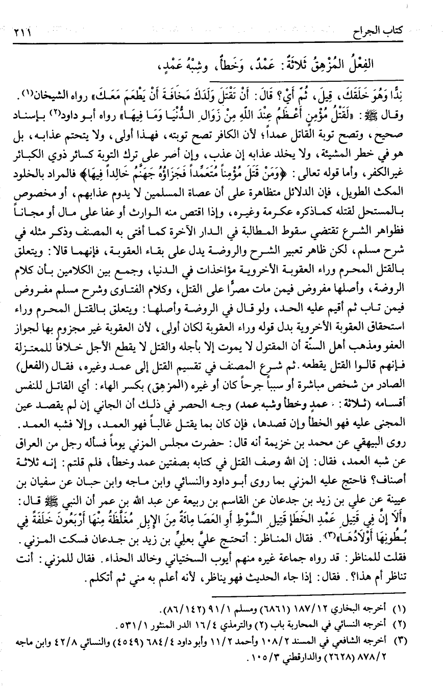ثُمَّ شَرَعَ الْمُصَنِّفُ فِي تَقْسِيمِ الْقَتْلِ إلَى عَمْدٍ وَغَيْرِهِ، فَقَالَ (الْفِعْلُ) الصَّادِرُ مِنْ شَخْصٍ مُبَاشَرَةً أَوْ سَبَبًا جُرْحًا كَانَ أَوْ غَيْرَهُ (الْمُزْهِقُ) بِكَسْرِ الْهَاءِ: أَيْ الْقَاتِلُ لِلنَّفْسِ أَقْسَامُهُ (ثَلَاثَةٌ: عَمْدٌ وَخَطَأٌ وَشِبْهُ عَمْدٍ) وَجْهُ الْحَصْرِ فِي ذَلِكَ أَنَّ الْجَانِيَ إنْ لَمْ يَقْصِدْ عَيْنَ الْمَجْنِيِّ عَلَيْهِ فَهُوَ الْخَطَأُ وَإِنْ قَصَدَهَا، فَإِنْ كَانَ بِمَا يَقْتُلُ غَالِبًا فَهُوَ الْعَمْدُ، وَإِلَّا فَشِبْهُ الْعَمْدِ. رَوَى الْبَيْهَقِيُّ عَنْ مُحَمَّدِ بْنِ خُزَيْمَةَ أَنَّهُ قَالَ: حَضَرْت مَجْلِسَ الْمُزَنِيِّ يَوْمًا فَسَأَلَهُ رَجُلٌ مِنْ الْعِرَاقِ عَنْ شِبْهِ الْعَمْدِ، فَقَالَ: إنَّ اللَّهَ وَصَفَ الْقَتْلَ فِي كِتَابِهِ بِصِفَتَيْنِ عَمْدٍ وَخَطَإٍ، فَلِمَ قُلْتُمْ: إنَّهُ ثَلَاثَةُ أَصْنَافٍ؟ فَاحْتَجَّ عَلَيْهِ الْمُزَنِيّ بِمَا رَوَى أَبُو دَاوُد وَالنَّسَائِيُّ وَابْنُ مَاجَهْ وَابْنُ حِبَّانَ عَنْ سُفْيَانَ بْنِ عُيَيْنَةَ عَنْ عَلِيِّ بْنِ زَيْدِ بْنِ جُدْعَانَ عَنْ الْقَاسِمِ بْنِ رَبِيعَةَ عَنْ عَبْدِ اللَّهِ بْنِ عُمَرَ أَنَّ النَّبِيَّ - صَلَّى اللَّهُ عَلَيْهِ وَسَلَّمَ - قَالَ: «أَلَا إنَّ فِي قَتِيلِ عَمْدِ الْخَطَإِ قَتِيلِ السَّوْطِ أَوْ الْعَصَا مِائَةً مِنْ الْإِبِلِ مُغَلَّظَةً مِنْهَا أَرْبَعُونَ خَلِفَةً فِي بُطُونِهَا أَوْلَادُهَا» . فَقَالَ الْمُنَاظِرُ: أَتَحْتَجُّ عَلَيَّ بِعَلِيِّ بْنِ زَيْدِ بْنِ جُدْعَانَ فَسَكَتَ الْمُزَنِيّ. فَقُلْت لِلْمُنَاظِرِ: قَدْ رَوَاهُ جَمَاعَةٌ غَيْرُهُ مِنْهُمْ أَيُّوبُ السِّخْتِيَانِيُّ وَخَالِدٌ الْحَذَّاءُ. فَقَالَ لِلْمُزَنِيِّ: أَنْتَ تُنَاظِرُ أَمْ هَذَا؟ . فَقَالَ: إذَا جَاءَ الْحَدِيثُ فَهُوَ يُنَاظِرُ، لِأَنَّهُ أَعْلَمُ بِهِ مِنِّي ثُمَّ أَتَكَلَّمُ.