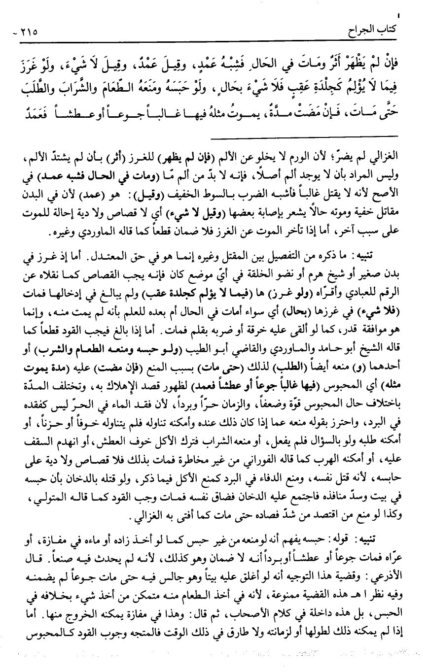 (وَلَوْ حَبَسَهُ وَمَنَعَهُ الطَّعَامَ وَالشَّرَابَ) أَوْ أَحَدَهُمَا (وَ) مَنَعَهُ أَيْضًا (الطَّلَبَ) لِذَلِكَ (حَتَّى مَاتَ) بِسَبَبِ الْمَنْعِ (فَإِنْ مَضَتْ) عَلَيْهِ (مُدَّةٌ يَمُوتُ مِثْلُهُ) أَيْ الْمَحْبُوسِ (فِيهَا غَالِبًا جُوعًا أَوْ عَطَشًا فَعَمْدٌ) لِظُهُورِ قَصْدِ الْإِهْلَاكِ بِهِ، وَتَخْتَلِفُ الْمُدَّةُ بِاخْتِلَافِ حَالِ الْمَحْبُوسِ قُوَّةً وَضَعْفًا، وَالزَّمَانِ حَرًّا وَبَرْدًا، لِأَنَّ فَقْدَ الْمَاءِ فِي الْحَرِّ لَيْسَ كَفَقْدِهِ فِي الْبَرْدِ، وَاحْتُرِزَ بِقَوْلِهِ مَنَعَهُ عَمَّا إذَا كَانَ ذَلِكَ عِنْدَهُ وَأَمْكَنَهُ تَنَاوُلُهُ فَلَمْ يَتَنَاوَلْهُ خَوْفًا أَوْ حُزْنًا، أَوْ أَمْكَنَهُ طَلَبُهُ وَلَوْ بِالسُّؤَالِ فَلَمْ يَفْعَلْ أَوْ مَنَعَهُ الشَّرَابَ فَتَرَكَ الْأَكْلَ خَوْفَ الْعَطَشِ، أَوْ انْهَدَمَ السَّقْفُ عَلَيْهِ، أَوْ أَمْكَنَهُ الْهَرَبُ كَمَا قَالَهُ الْفُورَانِيُّ مِنْ غَيْرِ مُخَاطَرَةٍ فَمَاتَ بِذَلِكَ فَلَا قِصَاصَ وَلَا دِيَةَ عَلَى حَابِسِهِ، لِأَنَّهُ قَتَلَ نَفْسَهُ، وَمَنْعُ الدِّفَاءَ فِي الْبَرْدِ كَمَنْعِ الْأَكْلِ فِيمَا ذُكِرَ، وَلَوْ قَتَلَهُ بِالدُّخَانِ بِأَنْ حَبَسَهُ فِي بَيْتٍ وَسَدَّ مَنَافِذَهُ فَاجْتَمَعَ عَلَيْهِ الدُّخَانُ فَضَاقَ نَفَسُهُ فَمَاتَ وَجَبَ الْقَوَدُ كَمَا قَالَهُ الْمُتَوَلِّي، وَكَذَا لَوْ مَنَعَ مَنْ افْتَصَدَ مِنْ شَدِّ فَصَادِهِ حَتَّى مَاتَ كَمَا أَفْتَى بِهِ الْغَزَالِيُّ