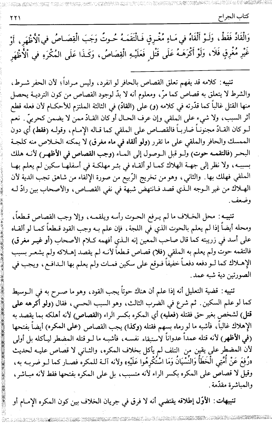 ـــــــــــــــــــــــــــــQتَنْبِيهٌ: كَلَامُهُ قَدْ يُفْهِمُ تَعَلُّقَ الْقِصَاصِ بِالْحَافِرِ لَوْ انْفَرَدَ، وَلَيْسَ مُرَادًا؛ لِأَنَّ الْحَفْرَ شَرْطٌ، وَالشَّرْطُ لَا يَتَعَلَّقُ بِهِ قِصَاصٌ كَمَا مَرَّ، وَمَعْلُومٌ أَنَّهُ لَا بُدَّ لِوُجُودِ الْقِصَاصِ مِنْ كَوْنِ التَّرْدِيَةِ يَحْصُلُ مِنْهَا الْقَتْلُ غَالِبًا كَمَا قَدَّرْته فِي كَلَامِهِ (وَ) عَلَى (الْقَادِّ) فِي الثَّالِثَةِ الْمُلْتَزِمِ لِلْأَحْكَامِ لِأَنَّ فِعْلَهُ قَطَعَ أَثَرَ السَّبَبِ، وَلَا شَيْءَ عَلَى الْمُلْقِي وَإِنْ عَرَفَ الْحَالَ أَوْ كَانَ الْقَادُّ مِمَّنْ لَا يَضْمَنُ كَحَرْبِيٍّ. نَعَمْ لَوْ كَانَ الْقَادُّ مَجْنُونًا ضَارِبًا فَالْقِصَاصُ عَلَى الْمُلْقِي كَمَا قَالَهُ الْإِمَامُ، وَقَوْلُهُ (فَقَطْ) أَيْ دُونَ الْمُمْسِكِ وَالْحَافِرِ وَالْمُلْقِي عَلَى مَا تَقَرَّرَ (وَلَوْ أَلْقَاهُ فِي مَاءٍ مُغْرِقٍ) لَا يُمْكِنُهُ الْخَلَاصُ مِنْهُ كَلُجَّةِ الْبَحْرِ (فَالْتَقَمَهُ حُوتٌ) وَلَوْ قَبْلَ الْوُصُولِ إلَى الْمَاءِ (وَجَبَ الْقِصَاصُ فِي الْأَظْهَرِ) لِأَنَّهُ هَلَكَ بِسَبَبِهِ، وَلَا نَظَرَ إلَى جِهَةِ الْهَلَاكِ كَمَا لَوْ أَلْقَاهُ فِي بِئْرٍ مُهْلِكَةٍ فِي أَسْفَلِهَا سِكِّينٌ لَمْ يَعْلَمْ بِهَا الْمُلْقِي فَهَلَكَ بِهَا. وَالثَّانِي، وَهُوَ مِنْ تَخْرِيجِ الرَّبِيعِ مِنْ صُورَةِ الْإِلْقَاءِ مِنْ شَاهِقٍ تَجِبُ الدِّيَةُ لِأَنَّ الْهَلَاكَ مِنْ غَيْرِ الْوَجْهِ الَّذِي قَصَدَ فَانْتَهَضَ شُبْهَةً فِي نَفْيِ الْقِصَاصِ، وَالْأَصْحَابُ بَيْنَ رَادٍّ لَهُ وَمُضَعِّفٍ.