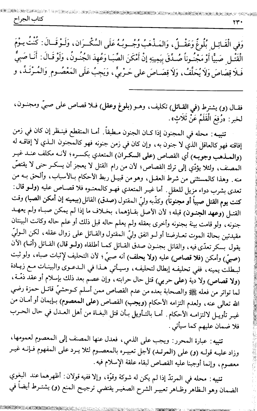 ـــــــــــــــــــــــــــــQفَقَالَ (وَ) يُشْتَرَطُ (فِي الْقَاتِلِ) تَكْلِيفٌ، وَهُوَ (بُلُوغٌ وَعَقْلٌ) فَلَا قِصَاصَ عَلَى صَبِيٍّ وَمَجْنُونٍ، لِخَبَرِ: " رُفِعَ الْقَلَمُ عَنْ ثَلَاثٍ "