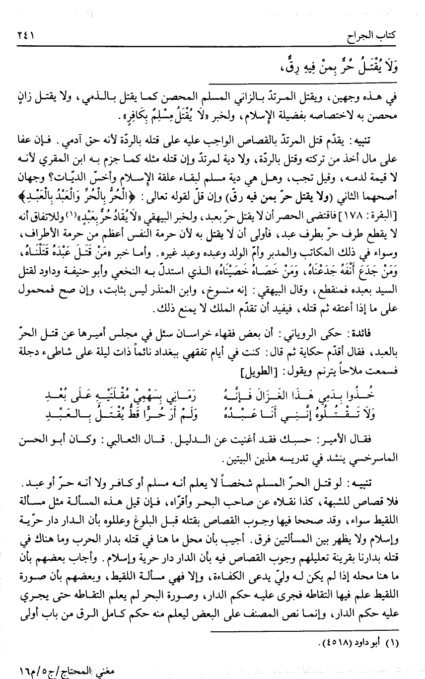 (وَلَا يُقْتَلُ حُرٌّ بِمَنْ فِيهِ رِقٌّ) وَإِنْ قَلَّ لِقَوْلِهِ تَعَالَى: {الْحُرُّ بِالْحُرِّ وَالْعَبْدُ بِالْعَبْدِ} [البقرة: 178] فَاقْتَضَى الْحَصْرُ أَنْ لَا يُقْتَلَ حُرٌّ بِعَبْدٍ، وَلِخَبَرِ الْبَيْهَقِيّ «لَا يُقَادُ حُرٌّ بِعَبْدٍ» وَلِلِاتِّفَاقِ أَنَّهُ لَا يُقْطَعُ طَرَفُ حُرٍّ بِطَرَفِ عَبْدٍ، فَأَوْلَى أَنْ لَا يُقْتَلَ بِهِ لِأَنَّ حُرْمَةَ النَّفْسِ أَعْظَمُ مِنْ حُرْمَةِ الْأَطْرَافِ، وَسَوَاءٌ فِي ذَلِكَ الْمُكَاتَبُ وَالْمُدَبَّرُ وَأُمُّ الْوَلَدِ وَعَبْدُهُ وَعَبْدُ غَيْرِهِ. وَأَمَّا خَبَرُ «مَنْ قَتَلَ عَبْدَهُ قَتَلْنَاهُ، وَمَنْ جَدَعَ أَنْفَهُ جَدَعْنَاهُ، وَمَنْ خَصَاهُ خَصَيْنَاهُ» الَّذِي اسْتَدَلَّ بِهِ النَّخَعِيُّ وَأَبُو حَنِيفَةَ وَدَاوُد لِقَتْلِ السَّيِّدِ بِعَبْدِهِ فَمُنْقَطِعٌ، وَقَالَ الْبَيْهَقِيُّ: إنَّهُ مَنْسُوخٌ، وَابْنُ الْمُنْذِرِ لَيْسَ بِثَابِتٍ، وَإِنْ صَحَّ فَمَحْمُولٌ عَلَى مَا إذَا أَعْتَقَهُ ثُمَّ قَتَلَهُ، فَيُفِيدُ أَنَّ تَقَدُّمَ الْمِلْكِ لَا يَمْنَعُ ذَلِكَ. فَائِدَةٌ: حَكَى الرُّويَانِيُّ: أَنَّ بَعْضَ فُقَهَاءِ خُرَاسَانَ سُئِلَ فِي مَجْلِسِ أَمِيرِهَا عَنْ قَتْلِ الْحُرِّ بِالْعَبْدِ، فَقَالَ أُقَدِّمُ حِكَايَةً ثُمَّ قَالَ: كُنْت فِي أَيَّامِ تَفَقُّهِي بِبَغْدَادَ نَائِمًا ذَاتَ لَيْلَةٍ عَلَى شَاطِئِ دِجْلَةَ فَسَمِعْت مَلَّاحًا يَتَرَنَّمُ الطَّوِيلَ وَيَقُولُ: خُذُوا بِدَمِي هَذَا الْغَزَالَ فَإِنَّهُ، رَمَانِي بِسَهْمَيْ مُقْلَتَيْهِ عَلَى بُعْدِ. وَلَا تَقْتُلُوهُ إنَّنِي أَنَا عَبْدُهُ، وَلَمْ أَرَ حُرًّا قَطُّ يُقْتَلُ بِالْعَبْدِ. فَقَالَ الْأَمِيرُ: حَسْبُك فَقَدْ أَغْنَيْت عَنْ الدَّلِيلِ. قَالَ الثَّعَالِبِيُّ: وَكَانَ أَبُو الْحَسَنِ الْمَاسَرْجِسِيُّ يُنْشِدُ فِي تَدْرِيسِهِ هَذَيْنِ الْبَيْتَيْنِ.