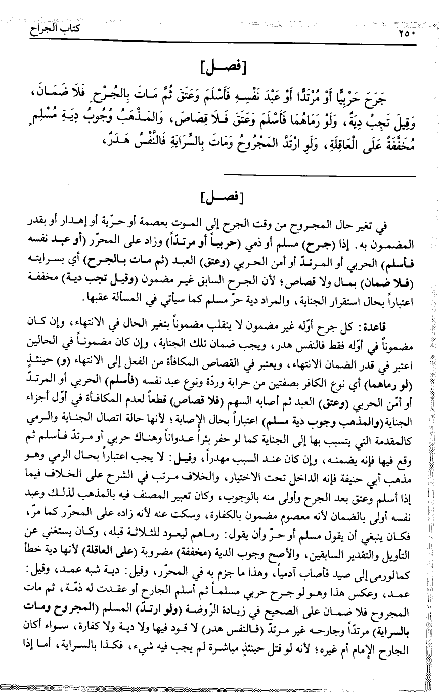 فَصْلٌ جَرَحَ حَرْبِيًّا أَوْ مُرْتَدًّا أَوْ عَبْدَ نَفْسِهِ فَأَسْلَمَ وَعَتَقَ ثُمَّ مَاتَ بِالْجُرْحِ فَلَا ضَمَانَ، وَقِيلَ: تَجِبُ دِيَةٌ، وَلَوْ رَمَاهُمَا فَأَسْلَمَ وَعَتَقَ فَلَا قِصَاصَ، وَالْمَذْهَبُ وُجُوبُ دِيَةِ مُسْلِمٍ مُخَفَّفَةً عَلَى الْعَاقِلَةِ.