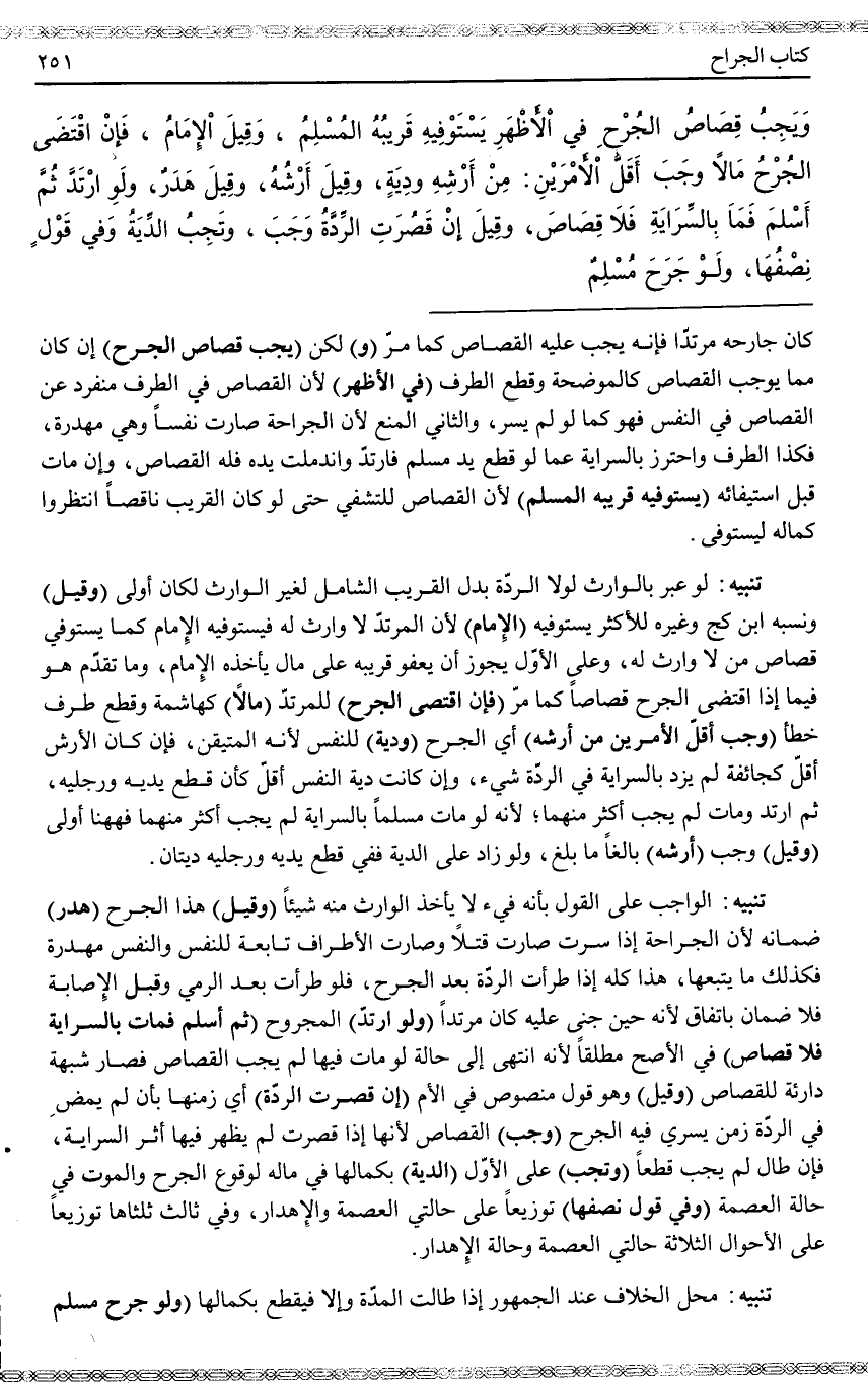 تَنْبِيهٌ: لَوْ عَبَّرَ بِالْوَارِثِ لَوْلَا الرِّدَّةُ بَدَلَ الْقَرِيبِ الشَّامِلِ لِغَيْرِ الْوَارِثِ لَكَانَ أَوْلَى (وَقِيلَ) وَنَسَبَهُ ابْنُ كَجٍّ وَغَيْرُهُ لِلْأَكْثَرِ يَسْتَوْفِيهِ (الْإِمَامُ) لِأَنَّ الْمُرْتَدَّ لَا وَارِثَ لَهُ فَيَسْتَوْفِيهِ الْإِمَامُ كَمَا يَسْتَوْفِي قِصَاصَ مَنْ لَا وَارِثَ لَهُ، وَعَلَى الْأَوَّلِ يَجُوزُ أَنْ يَعْفُوَ قَرِيبُهُ عَلَى مَالٍ يَأْخُذُهُ الْإِمَامُ، وَمَا تَقَدَّمَ هُوَ فِيمَا إذَا اقْتَضَى الْجُرْحُ قِصَاصًا كَمَا مَرَّ (فَإِنْ اقْتَضَى الْجُرْحُ) لِلْمُرْتَدِّ (مَالًا) كَهَاشِمَةٍ وَقَطْعِ طَرَفٍ خَطَأً (وَجَبَ أَقَلُّ الْأَمْرَيْنِ مِنْ أَرْشِهِ) أَيْ الْجُرْحِ (وَدِيَةً) لِلنَّفْسِ لِأَنَّهُ الْمُتَيَقَّنُ، فَإِنْ كَانَ الْأَرْشُ أَقَلَّ كَجَائِفَةٍ لَمْ يَزِدْ بِالسِّرَايَةِ فِي الرِّدَّةِ شَيْءٌ، وَإِنْ كَانَتْ دِيَةُ النَّفْسِ أَقَلَّ كَأَنْ قَطَعَ يَدَيْهِ وَرِجْلَيْهِ، ثُمَّ ارْتَدَّ وَمَاتَ لَمْ يَجِبْ أَكْثَرُ مِنْهُمَا؛ لِأَنَّهُ لَوْ مَاتَ مُسْلِمًا بِالسِّرَايَةِ لَمْ يَجِبْ أَكْثَرُ مِنْهُمَا فَهَهُنَا أَوْلَى (وَقِيلَ) وَجَبَ (أَرْشُهُ) بَالِغًا مَا بَلَغَ، وَلَوْ زَادَ عَلَى الدِّيَةِ فَفِي قَطْعِ يَدَيْهِ وَرِجْلَيْهِ دِيَتَانِ.