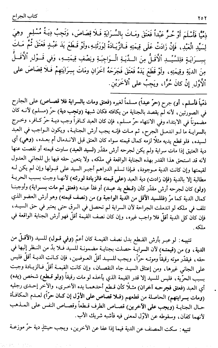 ـــــــــــــــــــــــــــــQذِمِّيًّا فَأَسْلَمَ، أَوْ) جَرَحَ (حُرٌّ عَبْدًا) مُسْلِمًا لِغَيْرِهِ (فَعَتَقَ وَمَاتَ بِالسِّرَايَةِ فَلَا قِصَاصَ) عَلَى الْجَارِحِ فِي الصُّورَتَيْنِ؛ لِأَنَّهُ لَمْ يَقْصِدْ بِالْجِنَايَةِ مَنْ يُكَافِئُهُ فَكَانَ شُبْهَةً.