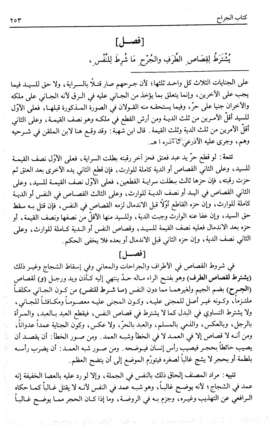 (فَصْلٌ) فِي شُرُوطِ الْقِصَاصِ فِي الْأَطْرَافِ وَالْجِرَاحَاتِ وَالْمَعَانِي وَفِي إسْقَاطِ الشِّجَاجِ وَغَيْرِ ذَلِكَ (يُشْتَرَطُ لِقِصَاصِ الطَّرَفِ) وَهُوَ بِفَتْحِ الرَّاءِ مَا لَهُ حَدٌّ يَنْتَهِي إلَيْهِ كَأُذُنٍ وَيَدٍ وَرِجْلٍ (وَ) لِقِصَاصِ (الْجُرْحِ) بِضَمِّ الْجِيمِ وَلِغَيْرِهِمَا مِمَّا دُونَ النَّفْسِ (مَا شُرِطَ لِلنَّفْسِ) مِنْ كَوْنِ الْجَانِي مُكَلَّفًا مُلْتَزِمًا، وَكَوْنِهِ غَيْرَ أَصْلٍ لِلْمَجْنِيِّ عَلَيْهِ، وَكَوْنِ الْمَجْنِيِّ عَلَيْهِ مَعْصُومًا وَمُكَافِئًا لِلْجَانِي، وَلَا يُشْتَرَطُ التَّسَاوِي فِي الْبَدَلِ كَمَا لَا يُشْتَرَطُ فِي قِصَاصِ النَّفْسِ، فَيُقْطَعُ الْعَبْدُ بِالْعَبْدِ، وَالْمَرْأَةُ بِالرَّجُلِ، وَبِالْعَكْسِ، وَالذِّمِّيُّ بِالْمُسْلِمِ، وَالْعَبْدُ بِالْحُرِّ، وَلَا عَكْسَ، وَكَوْنِ الْجِنَايَةِ عَمْدًا عُدْوَانًا، وَمِنْ أَنَّهُ لَا قِصَاصَ إلَّا فِي الْعَمْدِ لَا فِي الْخَطَأِ وَشِبْهِ الْعَمْدِ. وَمِنْ صُوَرِ الْخَطَأِ: أَنْ يَقْصِدَ أَنْ يُصِيبَ حَائِطًا بِحَجَرٍ فَيُصِيبَ رَأْسَ إنْسَانٍ فَيُوضِحَهُ. وَمِنْ صُوَرِ شِبْهِ الْعَمْدِ: أَنْ يَضْرِبَ رَأْسَهُ بِلَطْمَةٍ أَوْ بِحَجَرٍ لَا يَشُجُّ غَالِبًا لِصِغَرِهِ فَيَتَوَرَّمَ الْمَوْضِعُ إلَى أَنْ يَتَّضِحَ الْعَظْمُ.