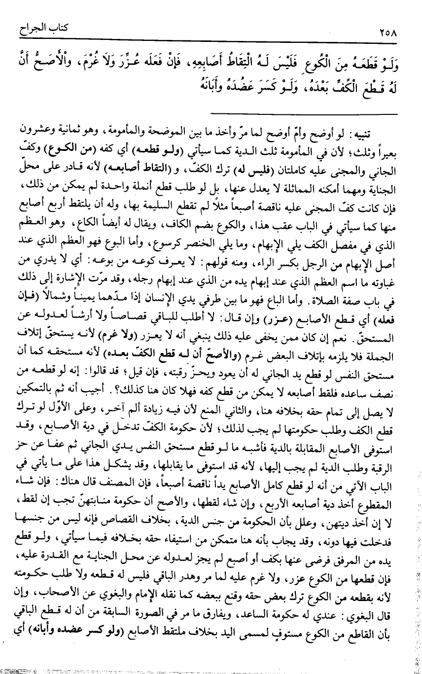 (وَلَوْ قَطَعَهُ) أَيْ كَفَّهُ (مِنْ الْكُوعِ) وَكَفُّ الْجَانِي وَالْمَجْنِيِّ عَلَيْهِ كَامِلَتَانِ (فَلَيْسَ لَهُ) تَرْكُ الْكَفِّ، وَ (الْتِقَاطُ أَصَابِعِهِ) لِأَنَّهُ قَادِرٌ عَلَى مَحَلِّ الْجِنَايَةِ وَمَهْمَا أَمْكَنَهُ الْمُمَاثَلَةُ لَا يَعْدِلُ عَنْهَا، بَلْ لَوْ طَلَبَ قَطْعَ أُنْمُلَةٍ وَاحِدَةٍ لَمْ يُمَكَّنْ مِنْ ذَلِكَ، فَإِنْ كَانَتْ كَفُّ الْمَجْنِيِّ عَلَيْهِ نَاقِصَةً أُصْبُعًا مَثَلًا لَمْ تُقْطَعْ السَّلِيمَةُ بِهَا، وَلَهُ أَنْ يَلْتَقِطَ أَرْبَعَ أَصَابِعَ مِنْهَا كَمَا سَيَأْتِي فِي الْبَابِ عَقِبَ هَذَا، وَالْكُوعُ بِضَمِّ الْكَافِ، وَيُقَالُ لَهُ أَيْضًا الْكَاعُ، وَهُوَ الْعَظْمُ الَّذِي فِي مَفْصِلِ الْكَفِّ يَلِي الْإِبْهَامَ، وَمَا يَلِي الْخِنْصَرَ كُرْسُوعٌ، وَأَمَّا الْبُوعُ فَهُوَ الْعَظْمُ الَّذِي عِنْدَ أَصْلِ الْإِبْهَامِ مِنْ الرِّجْلِ بِكَسْرِ الرَّاءِ، وَمِنْهُ قَوْلُهُمْ: لَا يَعْرِفُ ` كُوعَهُ مِنْ بُوعِهِ: أَيْ لَا يَدْرِي مِنْ غَبَاوَتِهِ مَا اسْمُ الْعَظْمِ الَّذِي عِنْدَ إبْهَامِ يَدِهِ مِنْ الَّذِي عِنْدَ إبْهَامِ رِجْلِهِ، وَقَدْ مَرَّتْ الْإِشَارَةُ إلَى ذَلِكَ فِي بَابِ صِفَةِ الصَّلَاةِ وَأَمَّا الْبَاعُ فَهُوَ مَا بَيْنَ طَرَفَيْ يَدَيْ الْإِنْسَانِ إذَا مَدَّهُمَا يَمِينًا وَشِمَالًا (فَإِنْ فَعَلَهُ) أَيْ قَطْعَ الْأَصَابِعِ (عُزِّرَ) وَإِنْ قَالَ: لَا أَطْلُبُ لِلْبَاقِي قِصَاصًا وَلَا أَرْشًا لِعُدُولِهِ عَنْ الْمُسْتَحَقِّ. نَعَمْ إنْ كَانَ مِمَّنْ يَخْفَى عَلَيْهِ ذَلِكَ يَنْبَغِي أَنَّهُ لَا يُعَزَّرُ (وَلَا غُرْمَ) لِأَنَّهُ يَسْتَحِقُّ إتْلَافَ الْجُمْلَةِ فَلَا يَلْزَمُهُ بِإِتْلَافِ الْبَعْضِ غُرْمٌ (وَالْأَصَحُّ أَنَّ لَهُ قَطْعَ الْكَفِّ بَعْدَهُ) لِأَنَّهُ مُسْتَحِقُّهُ كَمَا أَنَّ مُسْتَحِقَّ النَّفْسِ لَوْ قَطَعَ يَدَ الْجَانِي لَهُ أَنْ يَعُودَ وَيُحِزَّ رَقَبَتَهُ، فَإِنْ قِيلَ: قَدْ قَالُوا: إنَّهُ لَوْ قَطَعَهُ مِنْ نِصْفِ سَاعِدِهِ فَلَقَطَ أَصَابِعَهُ لَا يُمَكَّنُ مِنْ قَطْعِ كَفِّهِ فَهَلَّا كَانَ هُنَا كَذَلِكَ؟ .