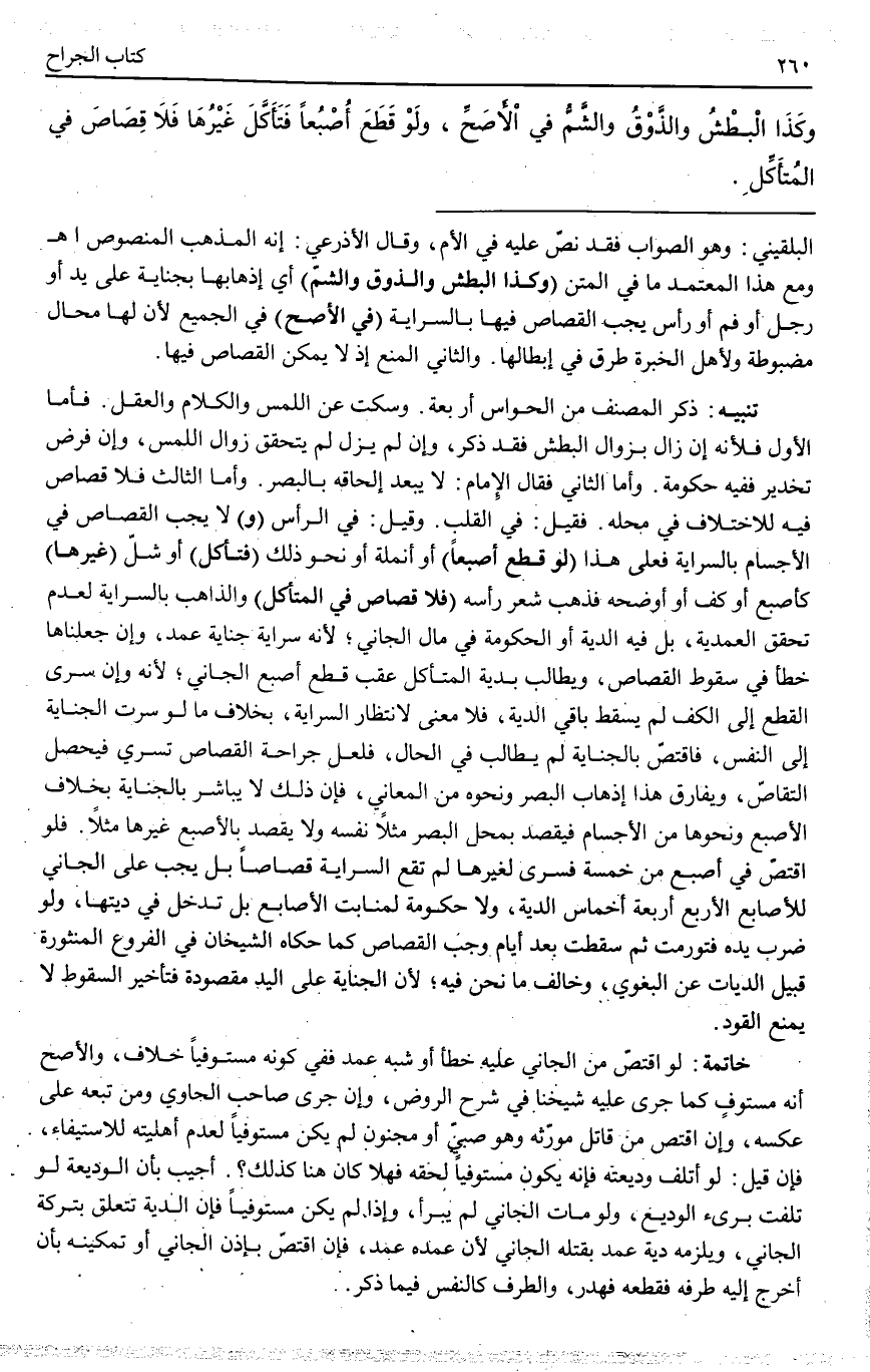 تَنْبِيهٌ: ذَكَرَ الْمُصَنِّفُ مِنْ الْحَوَاسِّ أَرْبَعَةً. وَسَكَتَ عَنْ اللَّمْسِ وَالْكَلَامِ وَالْعَقْلِ. فَأَمَّا الْأَوَّلُ فَلِأَنَّهُ إنْ زَالَ بِزَوَالِ الْبَطْشِ فَقَدْ ذُكِرَ، وَإِنْ لَمْ يَزُلْ لَمْ يَتَحَقَّقْ زَوَالُ اللَّمْسِ، وَإِنْ فُرِضَ تَخْدِيرٌ فَفِيهِ حُكُومَةٌ وَأَمَّا الثَّانِي فَقَالَ الْإِمَامُ: لَا يَبْعُدُ إلْحَاقُهُ بِالْبَصَرِ، وَأَمَّا الثَّالِثُ فَلَا قِصَاصَ فِيهِ لِلِاخْتِلَافِ فِي مَحَلِّهِ فَقِيلَ: فِي الْقَلْبِ. وَقِيلَ: فِي الرَّأْسِ.