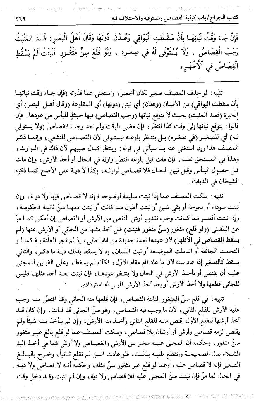 ـــــــــــــــــــــــــــــQتَنْبِيهٌ: لَوْ حَذَفَ الْمُصَنِّفُ " صَغِيرٍ " لَكَانَ أَخْصَرَ، وَاسْتَغْنَى عَمَّا قَدَّرْتُهُ (فَإِنْ جَاءَ وَقْتُ نَبَاتِهَا بِأَنْ سَقَطَتْ الْبَوَاقِي) مِنْ الْأَسْنَانِ (وَعُدْنَ) أَيْ نَبَتْنَ (دُونَهَا) أَيْ الْمَقْلُوعَةِ (وَقَالَ أَهْلُ الْبَصَرِ) أَيْ الْخِبْرَةِ (فَسَدَ الْمَنْبَتُ) بِحَيْثُ لَا يُتَوَقَّعُ نَبَاتُهَا (وَجَبَ الْقِصَاصُ) فِيهَا حِينَئِذٍ لِلْيَأْسِ مِنْ عَوْدِهَا.