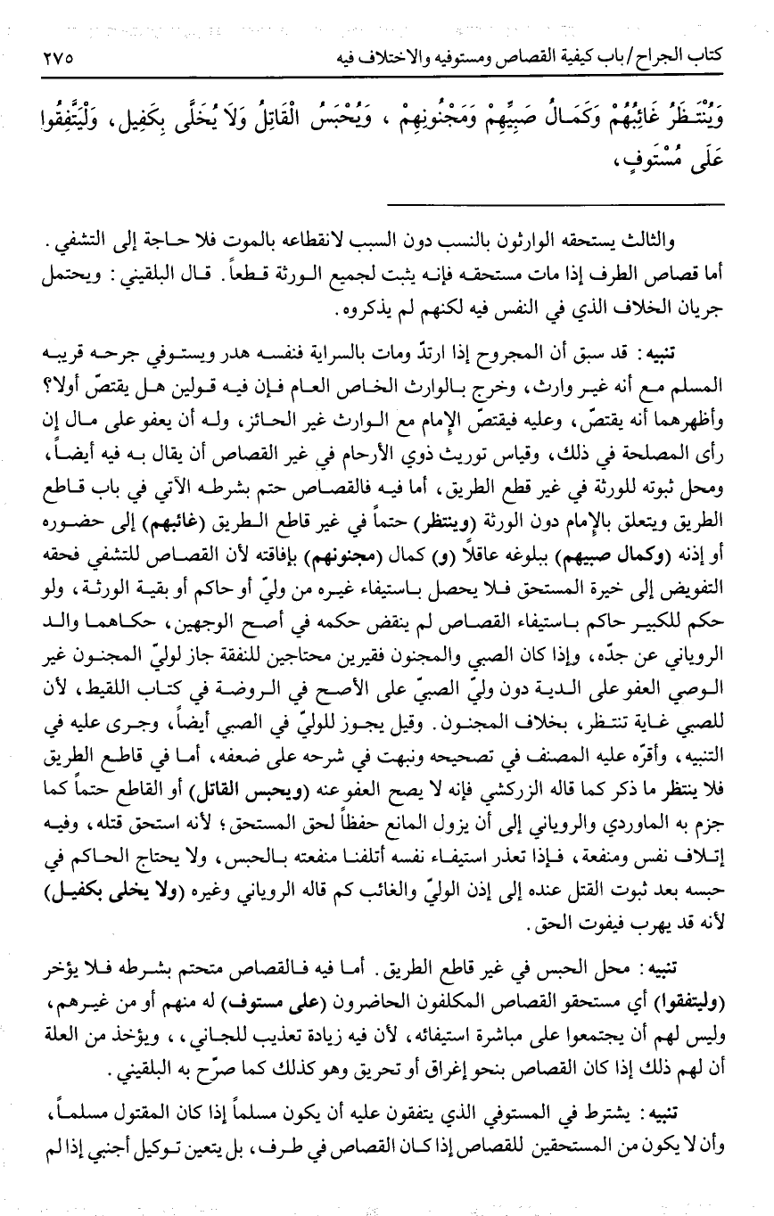 (وَيُنْتَظَرُ) حَتْمًا فِي غَيْرِ قَاطِعِ الطَّرِيقِ (غَائِبُهُمْ) إلَى حُضُورِهِ أَوْ إذْنِهِ (وَكَمَالُ صَبِيِّهِمْ) بِبُلُوغِهِ عَاقِلًا (وَ) كَمَالُ (مَجْنُونِهِمْ) بِإِفَاقَتِهِ؛ لِأَنَّ الْقِصَاصَ لِلتَّشَفِّي فَحَقُّهُ التَّفْوِيضُ إلَى خِيَرَةِ الْمُسْتَحِقِّ فَلَا يَحْصُلُ بِاسْتِيفَاءِ غَيْرِهِ مِنْ وَلِيٍّ أَوْ حَاكِمٍ أَوْ بَقِيَّةِ الْوَرَثَةِ، وَلَوْ حَكَمَ لِلْكَبِيرِ حَاكِمٌ بِاسْتِيفَاءِ الْقِصَاصِ لَمْ يُنْقَضْ حُكْمُهُ فِي أَصَحِّ الْوَجْهَيْنِ، حَكَاهُمَا وَالِدُ الرُّويَانِيِّ عَنْ جَدِّهِ، وَإِذَا كَانَ الصَّبِيُّ وَالْمَجْنُونُ فَقِيرَيْنِ مُحْتَاجَيْنِ لِلنَّفَقَةِ جَازَ لِوَلِيِّ الْمَجْنُونِ غَيْرِ الْوَصِيِّ الْعَفْوُ عَلَى الدِّيَةِ دُونَ وَلِيِّ الصَّبِيِّ عَلَى الْأَصَحِّ فِي الرَّوْضَةِ فِي كِتَابِ اللَّقِيطِ؛ لِأَنَّ لِلصَّبِيِّ غَايَةً تُنْتَظَرُ، بِخِلَافِ الْمَجْنُونِ.