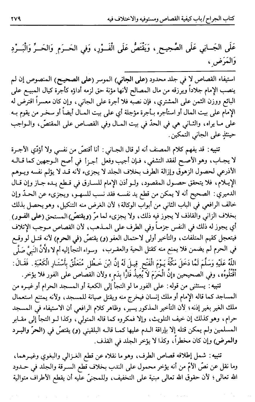 تَنْبِيهٌ: يُسْتَثْنَى مِنْ قَوْلِهِ: عَلَى الْفَوْرِ مَا لَوْ الْتَجَأَ إلَى الْكَعْبَةِ أَوْ الْمَسْجِدِ الْحَرَامِ أَوْ غَيْرِهِ مِنْ الْمَسَاجِدِ كَمَا قَالَهُ الْإِمَامُ أَوْ مِلْكِ إنْسَانٍ فَيَخْرُجُ مِنْهُ وَيُقْتَلُ صِيَانَةً لِلْمَسْجِدِ؛ وَلِأَنَّهُ يُمْتَنَعُ اسْتِعْمَالُ مِلْكِ الْغَيْرِ بِغَيْرِ إذْنِهِ؛ لِأَنَّ التَّأْخِيرَ الْمَذْكُورَ يَسِيرٌ، وَظَاهِرُ كَلَامِ الرَّافِعِيِّ أَنَّ الِاسْتِيفَاءَ فِي الْمَسْجِدِ حَرَامٌ، وَهُوَ كَذَلِكَ إنْ خِيفَ التَّلْوِيثُ، وَإِلَّا فَمَكْرُوهٌ كَمَا قَالَهُ الْمُتَوَلِّي، وَكَذَا لَوْ الْتَجَأَ إلَى مَقَابِرِ الْمُسْلِمِينَ وَلَمْ يُمْكِنْ قَتْلُهُ إلَّا بِإِرَاقَةِ الدَّمِ عَلَيْهَا كَمَا قَالَهُ الْبُلْقِينِيُّ.