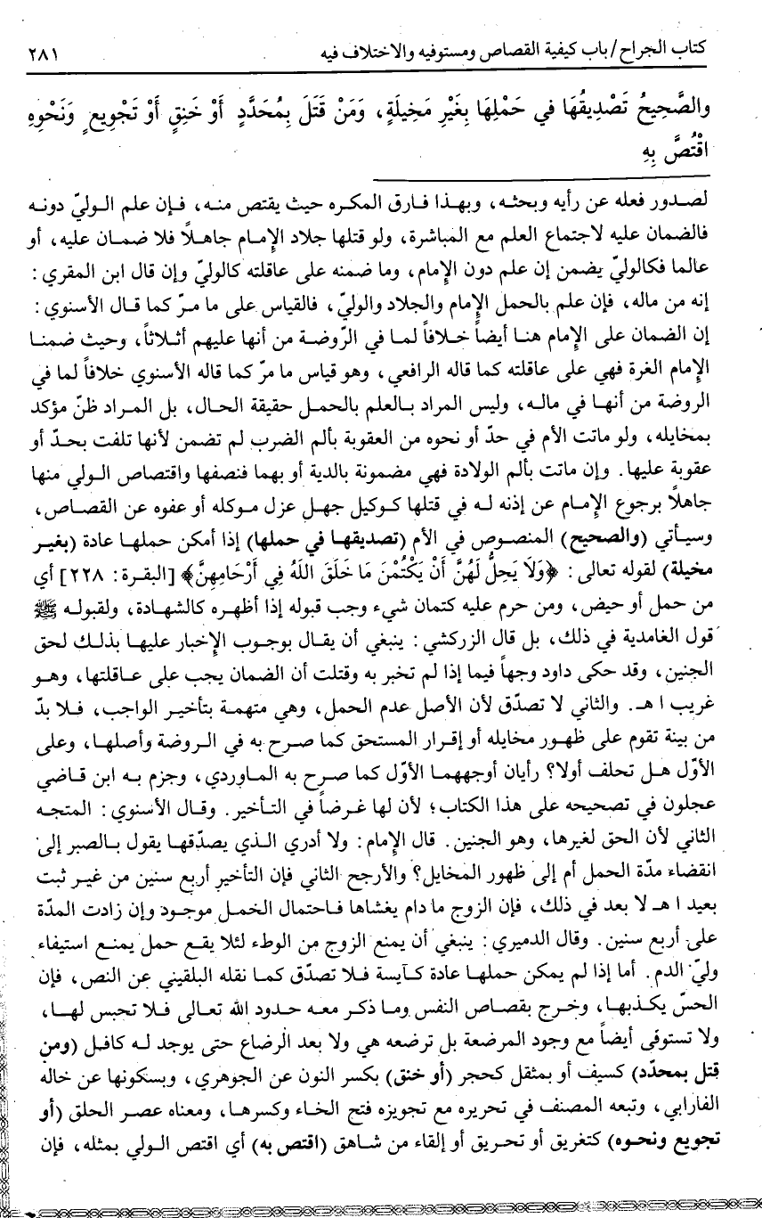 وَلَوْ مَاتَتْ الْأُمُّ فِي حَدٍّ أَوْ نَحْوِهِ مِنْ الْعُقُوبَةِ بِأَلَمِ الضَّرْبِ لَمْ تُضْمَنْ؛ لِأَنَّهَا تَلِفَتْ بِحَدٍّ أَوْ عُقُوبَةٍ عَلَيْهَا. وَإِنْ مَاتَتْ بِأَلَمِ الْوِلَادَةِ فَهِيَ مَضْمُونَةٌ بِالدِّيَةِ أَوْ بِهِمَا فَنِصْفُهَا، وَاقْتِصَاصُ الْوَلِيِّ مِنْهَا جَاهِلًا بِرُجُوعِ الْإِمَامِ عَنْ إذْنِهِ لَهُ فِي قَتْلِهَا كَوَكِيلٍ جَهِلَ عَزْلَ مُوَكِّلِهِ أَوْ عَفْوِهِ عَنْ الْقِصَاصِ، وَسَيَأْتِي (وَالصَّحِيحُ) الْمَنْصُوصُ فِي الْأُمِّ (تَصْدِيقُهَا فِي 414 حَمْلِهَا) إذَا أَمْكَنَ حَمْلُهَا عَادَةً (بِغَيْرِ مَخِيلَةٍ) لِقَوْلِهِ تَعَالَى: {وَلا يَحِلُّ لَهُنَّ أَنْ يَكْتُمْنَ مَا خَلَقَ اللَّهُ فِي أَرْحَامِهِنَّ} [البقرة: 228] أَيْ مِنْ حَمْلٍ أَوْ حَيْضٍ، وَمَنْ حَرُمَ عَلَيْهِ كِتْمَانُ شَيْءٍ وَجَبَ قَبُولُهُ إذَا أَظْهَرَهُ كَالشَّهَادَةِ، وَلِقَبُولِهِ - صَلَّى اللَّهُ عَلَيْهِ وَسَلَّمَ - قَوْلَ الْغَامِدِيَّةِ فِي ذَلِكَ، بَلْ قَالَ الزَّرْكَشِيُّ: يَنْبَغِي أَنْ يُقَالَ بِوُجُوبِ الْإِخْبَارِ عَلَيْهَا بِذَلِكَ لِحَقِّ الْجَنِينِ، وَقَدْ حَكَى دَاوُد وَجْهًا فِيمَا إذَا لَمْ تُخْبِرْ بِهِ وَقُتِلَتْ أَنَّ الضَّمَانَ يَجِبُ عَلَى عَاقِلَتِهَا، وَهُوَ غَرِيبٌ. اهـ.