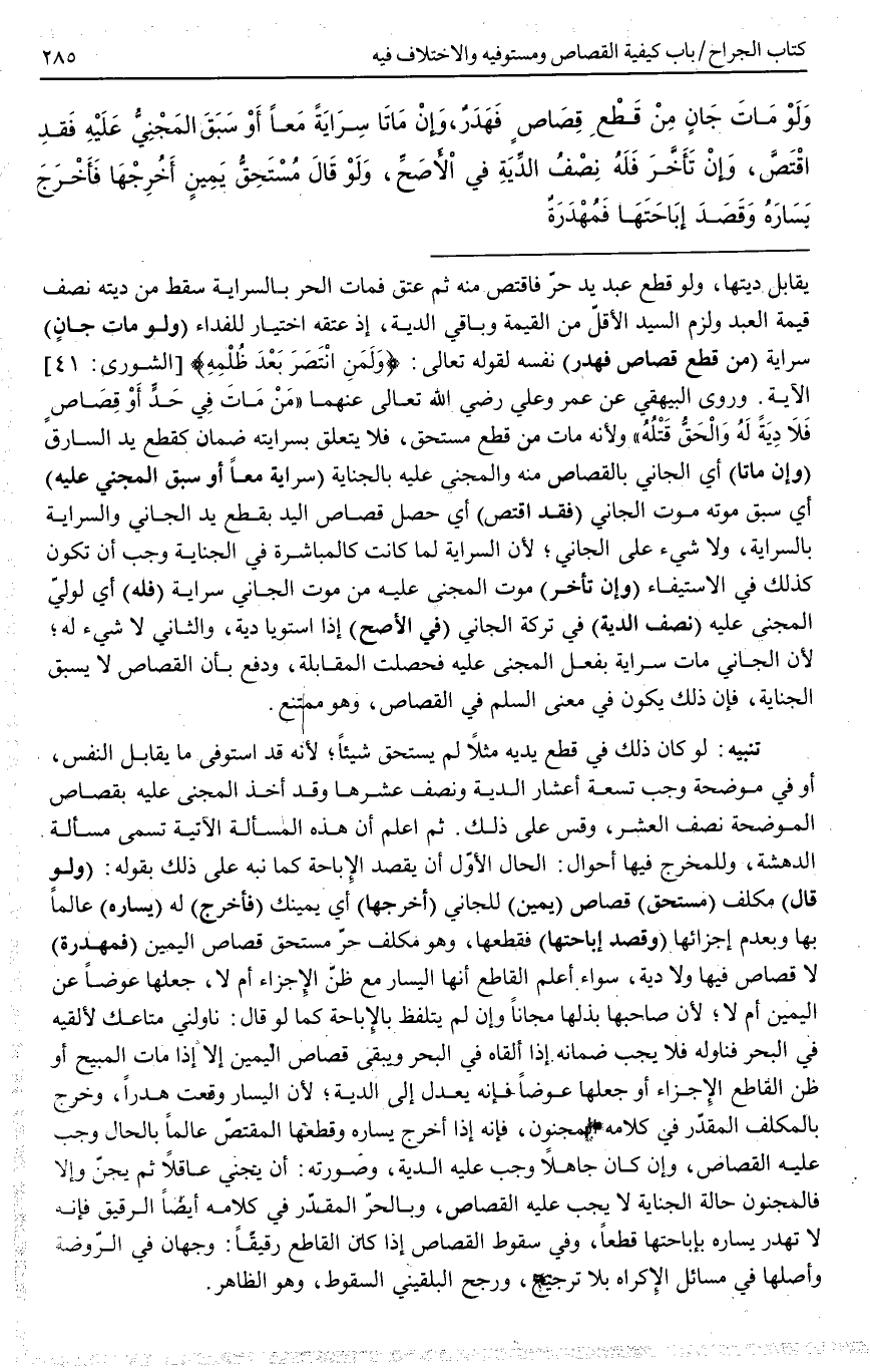 (وَلَوْ مَاتَ جَانٍ) سِرَايَةً (مِنْ قَطْعِ قِصَاصٍ فَهَدَرٌ) نَفْسُهُ لِقَوْلِهِ تَعَالَى: {وَلَمَنِ انْتَصَرَ بَعْدَ ظُلْمِهِ} [الشورى: 41] الْآيَةَ. وَرَوَى الْبَيْهَقِيُّ عَنْ عُمَرَ وَعَلِيٍّ - رَضِيَ اللَّهُ تَعَالَى عَنْهُمَا - «مَنْ مَاتَ فِي حَدٍّ أَوْ قِصَاصٍ فَلَا دِيَةَ لَهُ وَالْحَقُّ قَتْلُهُ» وَلِأَنَّهُ مَاتَ مِنْ قَطْعٍ مُسْتَحَقٍّ فَلَا يَتَعَلَّقُ بِسِرَايَتِهِ ضَمَانٌ كَقَطْعِ يَدِ السَّارِقِ (وَإِنْ مَاتَا) أَيْ الْجَانِي بِالْقِصَاصِ مِنْهُ وَالْمَجْنِيُّ عَلَيْهِ بِالْجِنَايَةِ (سِرَايَةً مَعًا أَوْ سَبَقَ الْمَجْنِيُّ عَلَيْهِ) أَيْ سَبَقَ مَوْتُهُ مَوْتَ الْجَانِي (فَقَدْ اقْتَصَّ) أَيْ حَصَلَ قِصَاصُ الْيَدِ بِقَطْعِ يَدِ الْجَانِي وَالسِّرَايَةُ بِالسِّرَايَةِ، وَلَا شَيْءَ عَلَى الْجَانِي؛ لِأَنَّ السِّرَايَةَ لَمَّا كَانَتْ كَالْمُبَاشَرَةِ فِي الْجِنَايَةِ وَجَبَ أَنْ تَكُونَ كَذَلِكَ فِي الِاسْتِيفَاءِ (وَإِنْ تَأَخَّرَ) مَوْتُ الْمَجْنِيِّ عَلَيْهِ مِنْ مَوْتِ الْجَانِي سِرَايَةً (فَلَهُ) أَيْ لِوَلِيِّ الْمَجْنِيِّ عَلَيْهِ (نِصْفُ الدِّيَةِ) فِي تَرِكَةِ الْجَانِي (فِي الْأَصَحِّ) إذَا اسْتَوَيَا دِيَةً، وَالثَّانِي لَا شَيْءَ لَهُ؛ لِأَنَّ الْجَانِيَ مَاتَ سِرَايَةً بِفِعْلِ الْمَجْنِيِّ عَلَيْهِ فَحَصَلَتْ الْمُقَابَلَةُ، وَدُفِعَ بِأَنَّ الْقِصَاصَ لَا يَسْبِقُ الْجِنَايَةَ، فَإِنَّ ذَلِكَ يَكُونُ فِي مَعْنَى السَّلَمِ فِي الْقِصَاصِ، وَهُوَ مُمْتَنِعٌ.