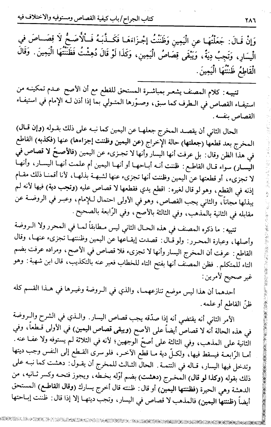 تَنْبِيهٌ: مَا ذَكَرَهُ الْمُصَنِّفُ فِي هَذِهِ الْحَالِ الثَّانِي لَيْسَ مُطَابِقًا لِمَا فِي الْمُحَرَّرِ وَلَا الرَّوْضَةِ وَأَصْلِهَا، وَعِبَارَةُ الْمُحَرَّرِ: وَلَوْ قَالَ: قَصَدْتُ إيقَاعَهَا عَنْ الْيَمِينِ وَظَنَنْتُهَا تُجْزِئُ عَنْهَا، وَقَالَ الْقَاطِعُ: عَرَفْتُ أَنَّ الْمُخْرَجَ الْيَسَارُ وَأَنَّهَا لَا تُجْزِئُ فَلَا قِصَاصَ فِي الْأَصَحِّ، وَمُرَادُهُ عَرَفْتُ بِضَمِّ التَّاءِ لِلْمُتَكَلِّمِ. فَظَنَّ الْمُصَنِّفُ أَنَّهَا بِفَتْحِ التَّاءِ لِلْخِطَابِ فَعَبَّرَ عَنْهُ بِالتَّكْذِيبِ، قَالَ ابْنُ شُهْبَةَ: وَهُوَ غَيْرُ صَحِيحٍ لِأَمْرَيْنِ: أَحَدُهُمَا أَنَّ هَذَا لَيْسَ مَوْضِعَ تَنَازُعِهِمَا، وَاَلَّذِي فِي الرَّوْضَةِ وَغَيْرِهَا فِي هَذَا الْقِسْمِ كُلِّهِ ظَنُّ الْقَاطِعِ أَوْ عِلْمُهُ. الْأَمْرُ الثَّانِي أَنَّهُ يَقْتَضِي أَنَّهُ إذَا صَدَّقَهُ يَجِبُ قِصَاصُ الْيَسَارِ. وَاَلَّذِي فِي الشَّرْحِ وَالرَّوْضَةِ فِي هَذِهِ الْحَالَةِ أَنَّهُ لَا قِصَاصَ أَيْضًا عَلَى الْأَصَحِّ (وَيَبْقَى قِصَاصُ الْيَمِينِ) فِي الْأُولَى قَطْعًا، وَفِي الثَّانِيَةِ عَلَى الْمَذْهَبِ، وَفِي الثَّالِثَةِ عَلَى أَصَحِّ الْوَجْهَيْنِ؛ لِأَنَّهُ فِي الثَّلَاثَةِ لَمْ يَسْتَوْفِهِ وَلَا عَفَا عَنْهُ. أَمَّا الرَّابِعَةُ فَيَسْقُطُ فِيهَا، وَلِكُلٍّ دِيَةُ مَا قَطَعَ الْآخَرُ، فَلَوْ سَرَى الْقَطْعُ إلَى النَّفْسِ وَجَبَ دِيَتُهَا وَتَدْخُلُ فِيهَا الْيَسَارُ، قَالَ فِي التَّتِمَّةِ: الْحَالُ الثَّالِثُ لِلْمُخْرِجِ أَنْ يَقُولَ: دُهِشْتُ كَمَا نَبَّهَ عَلَى ذَلِكَ بِقَوْلِهِ (وَكَذَا لَوْ 387 قَالَ) الْمُخْرِجُ (دُهِشْتُ) بِضَمِّ أَوَّلِهِ بِخَطِّهِ، وَيَجُوزُ فَتْحُهُ وَكَسْرُ ثَانِيهِ، مِنْ الدَّهْشَةِ وَهِيَ الْحِيرَةُ (فَظَنَنْتُهَا الْيَمِينَ) أَوْ قَالَ: ظَنَنْتُهُ قَالَ أَخْرِجْ يَسَارَكَ (وَقَالَ الْقَاطِعُ) الْمُسْتَحِقُّ أَيْضًا (ظَنَنْتُهَا الْيَمِينَ) فَالْمَذْهَبُ لَا قِصَاصَ فِي الْيَسَارِ، وَتَجِبُ دِيَتُهَا إلَّا إذَا قَالَ: ظَنَنْتُ إبَاحَتَهَا