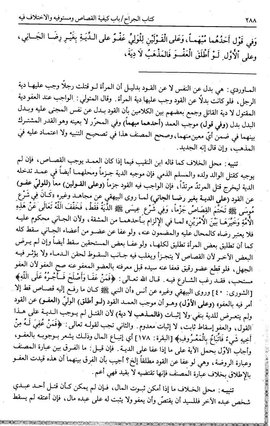 (لَوْ أَطْلَقَ) الْوَلِيُّ (الْعَفْوَ) عَنْ الْقَوَدِ وَلَمْ يَتَعَرَّضْ لِلدِّيَةِ بِنَفْيٍ وَلَا إثْبَاتٍ (فَالْمَذْهَبُ لَا دِيَةَ) ؛ لِأَنَّ الْقَتْلَ لَمْ يُوجِبْ الدِّيَةَ عَلَى هَذَا الْقَوْلِ، وَالْعَفْوُ إسْقَاطُ ثَابِتٍ، لَا إثْبَاتُ مَعْدُومٍ. وَالثَّانِي تَجِبُ لِقَوْلِهِ تَعَالَى: {فَمَنْ عُفِيَ لَهُ مِنْ أَخِيهِ شَيْءٌ فَاتِّبَاعٌ بِالْمَعْرُوفِ} [البقرة: 178] أَيْ اتِّبَاعُ الْمَالِ وَذَلِكَ يُشْعِرُ بِوُجُوبِهِ بِالْعَفْوِ.