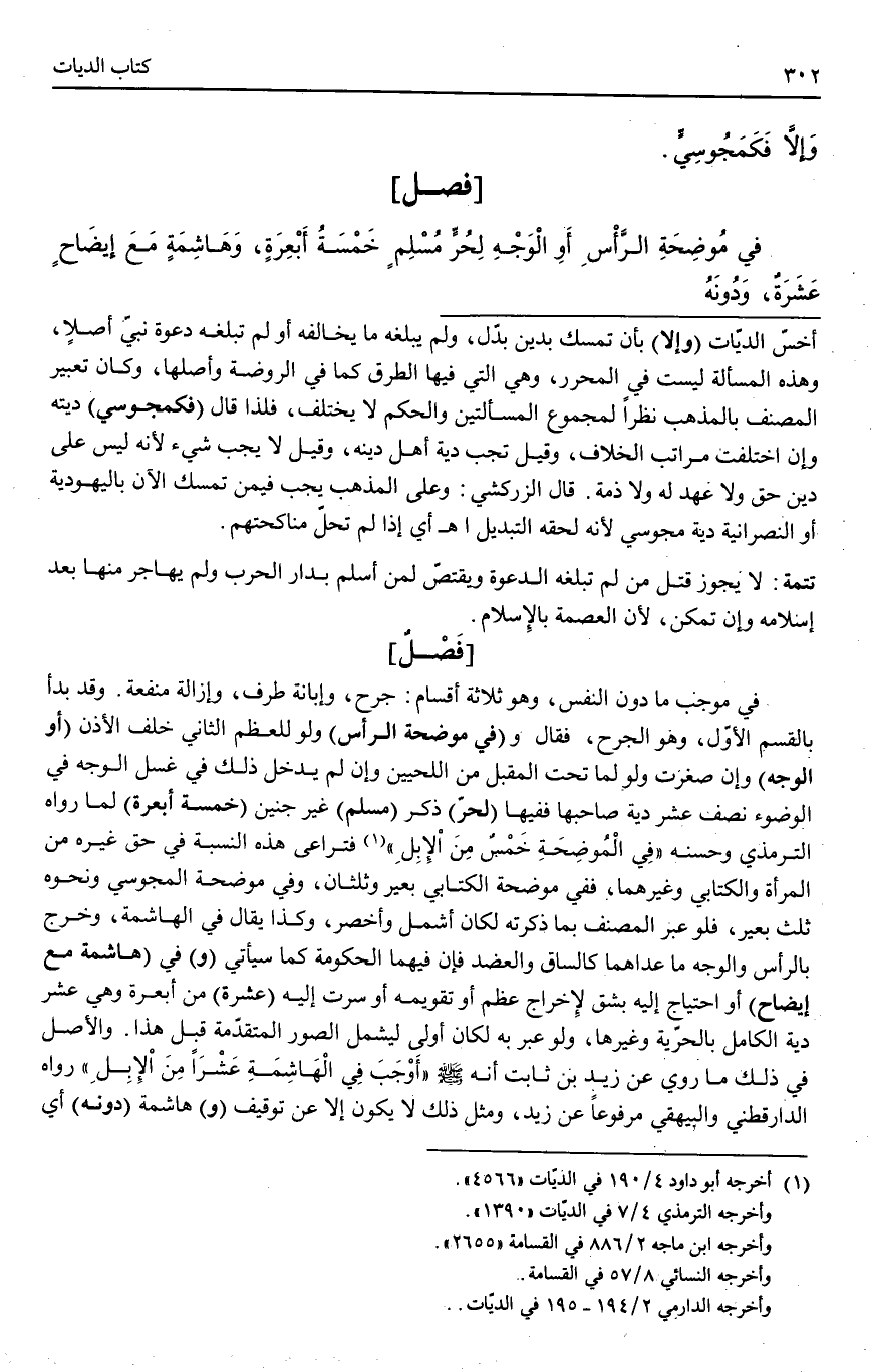 فَصْلٌ فِي مُوضِحَةِ الرَّأْسِ أَوْ الْوَجْهِ لِحُرٍّ مُسْلِمٍ خَمْسَةُ أَبْعِرَةٍ، وَهَاشِمَةٍ مَعَ إيضَاحٍ عَشَرَةٌ، وَدُونَهُ