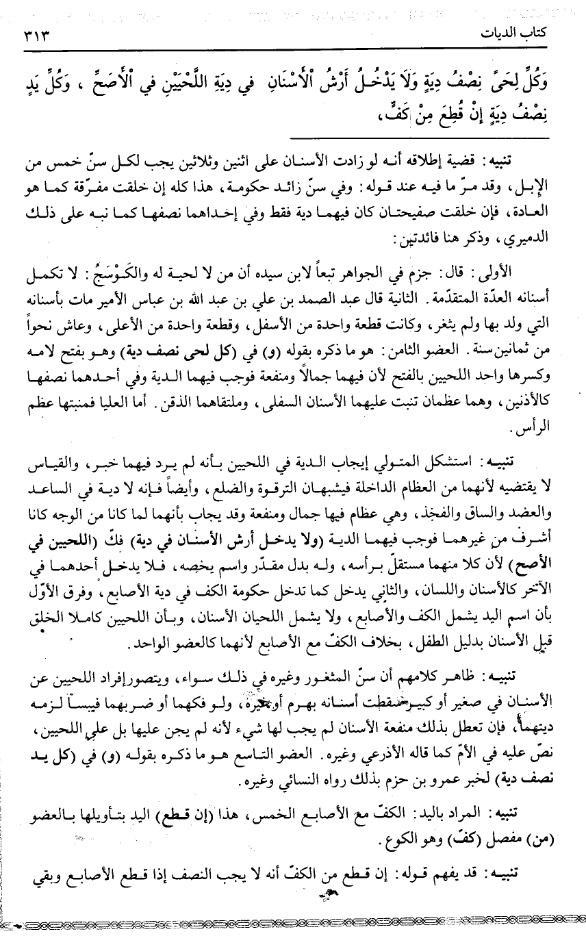 ـــــــــــــــــــــــــــــQتَنْبِيهٌ: قَضِيَّةُ إطْلَاقِهِ أَنَّهُ لَوْ زَادَتْ الْأَسْنَانُ عَلَى اثْنَيْنِ وَثَلَاثِينَ يَجِبُ لِكُلِّ سِنٍّ خَمْسٌ مِنْ الْإِبِلِ، وَقَدْ مَرَّ مَا فِيهِ عِنْدَ قَوْلِهِ: وَفِي سِنٍّ زَائِدٍ حُكُومَةٌ، هَذَا كُلُّهُ إنْ خُلِقَتْ مُفَرَّقَةً كَمَا هُوَ الْعَادَةُ، فَإِنْ خُلِقَتْ صَفِيحَتَانِ كَانَ فِيهِمَا دِيَةٌ فَقَطْ وَفِي إحْدَاهُمَا نِصْفُهَا كَمَا نَبَّهَ عَلَى ذَلِكَ الدَّمِيرِيُّ، وَذَكَرَ هُنَا فَائِدَتَيْنِ الْأُولَى قَالَ: جَزَمَ فِي الْجَوَاهِرِ تَبَعًا لِابْنِ سِيدَهْ أَنَّ مَنْ لَا لِحْيَةَ لَهُ وَالْكَوْسَجُ: لَا تَكْمُلُ أَسْنَانُهُ الْعِدَّةَ الْمُتَقَدِّمَةَ. الثَّانِيَةُ: قَالَ عَبْدُ الصَّمَدِ بْنُ عَلِيِّ بْنِ عَبْدِ اللَّهِ بْنِ عَبَّاسٍ الْأَمِيرُ مَاتَ بِأَسْنَانِهِ الَّتِي وُلِدَ بِهَا وَلَمْ يُثْغِرْ، وَكَانَتْ قِطْعَةً وَاحِدَةً مِنْ الْأَسْفَلِ، وَقِطْعَةً وَاحِدَةً مِنْ الْأَعْلَى، وَعَاشَ نَحْوًا مِنْ ثَمَانِينَ سَنَةً.