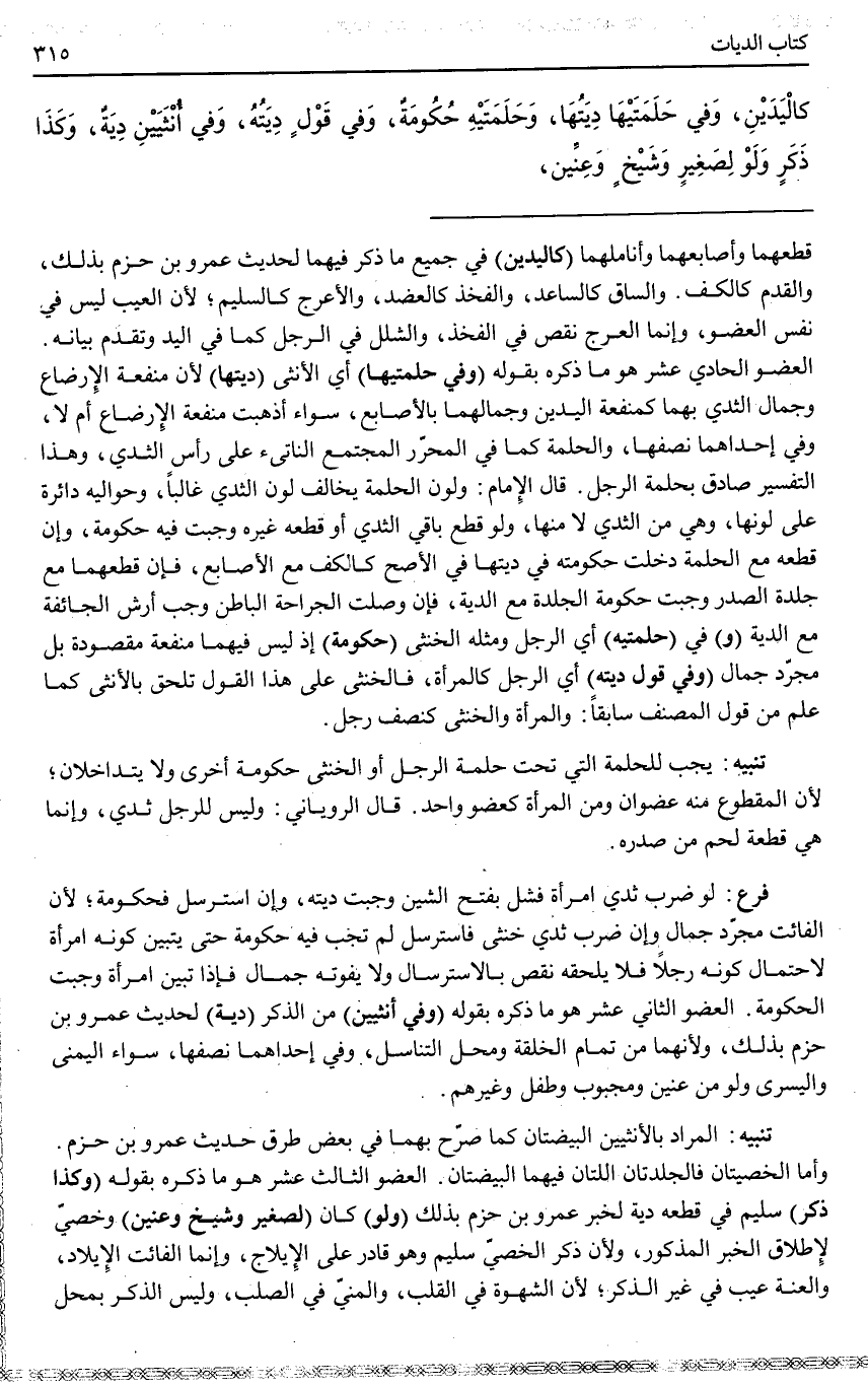 ـــــــــــــــــــــــــــــQقَطْعِهِمَا وَأَصَابِعِهِمَا وَأَنَامِلِهِمَا (كَالْيَدَيْنِ) فِي جَمِيعِ مَا ذُكِرَ فِيهِمَا لِحَدِيثِ عَمْرِو بْنِ حَزْمٍ بِذَلِكَ، وَالْقَدَمُ كَالْكَفِّ. وَالسَّاقُ كَالسَّاعِدِ، وَالْفَخِذُ كَالْعَضُدِ، وَالْأَعْرَجُ كَالسَّلِيمِ؛ لِأَنَّ الْعَيْبَ لَيْسَ فِي نَفْسِ الْعُضْوِ، وَإِنَّمَا الْعَرَجُ نَقْصٌ فِي الْفَخِذِ، وَالشَّلَلُ فِي الرِّجْلِ كَمَا فِي الْيَدِ وَتَقَدَّمَ بَيَانُهُ.
